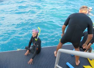 I enjoy snorkeling, any chance to snorkel is a treat, and we’ve seen some wonderful underwater scenery here and there. For that reason, Australia’s Great Barrier Reef (GBR), is an iconic place we’ve decided to visit. There are hundreds of boats that go out to the reef, and many different ways to have a look. Non-swimmers can ride glass-bottom boats or semi-submersible watercraft. Families can visit a large pontoon that provides a place for kids to jump in and splash around. Divers can explore deep places. We chose to go with a group based in Port Douglas, Wavelength, that provides a snorkeling trip to Opal Reef. The company is owned and operated by a marine biologist based in Port Douglas, and all the on-board staff are marine biologists.