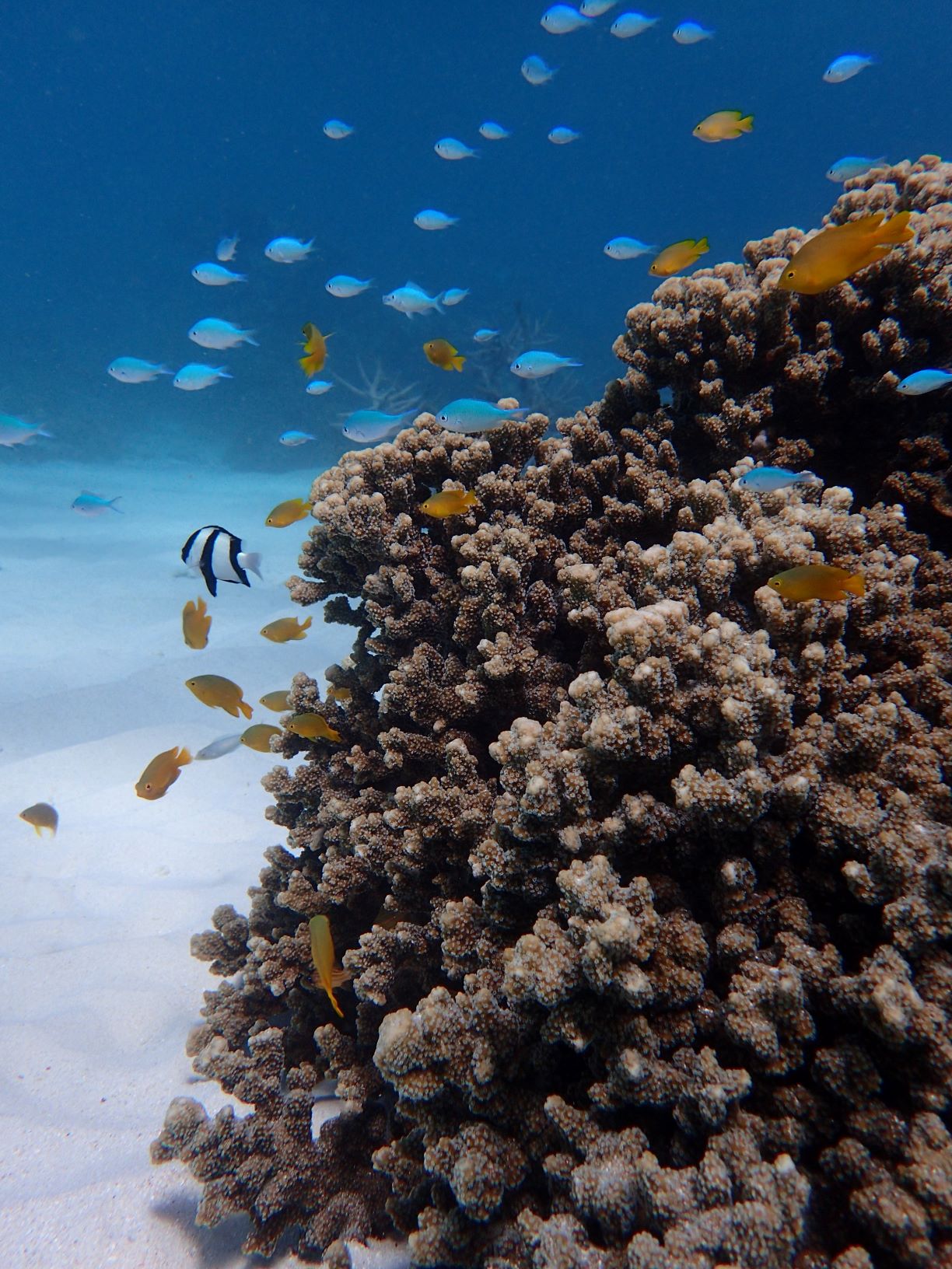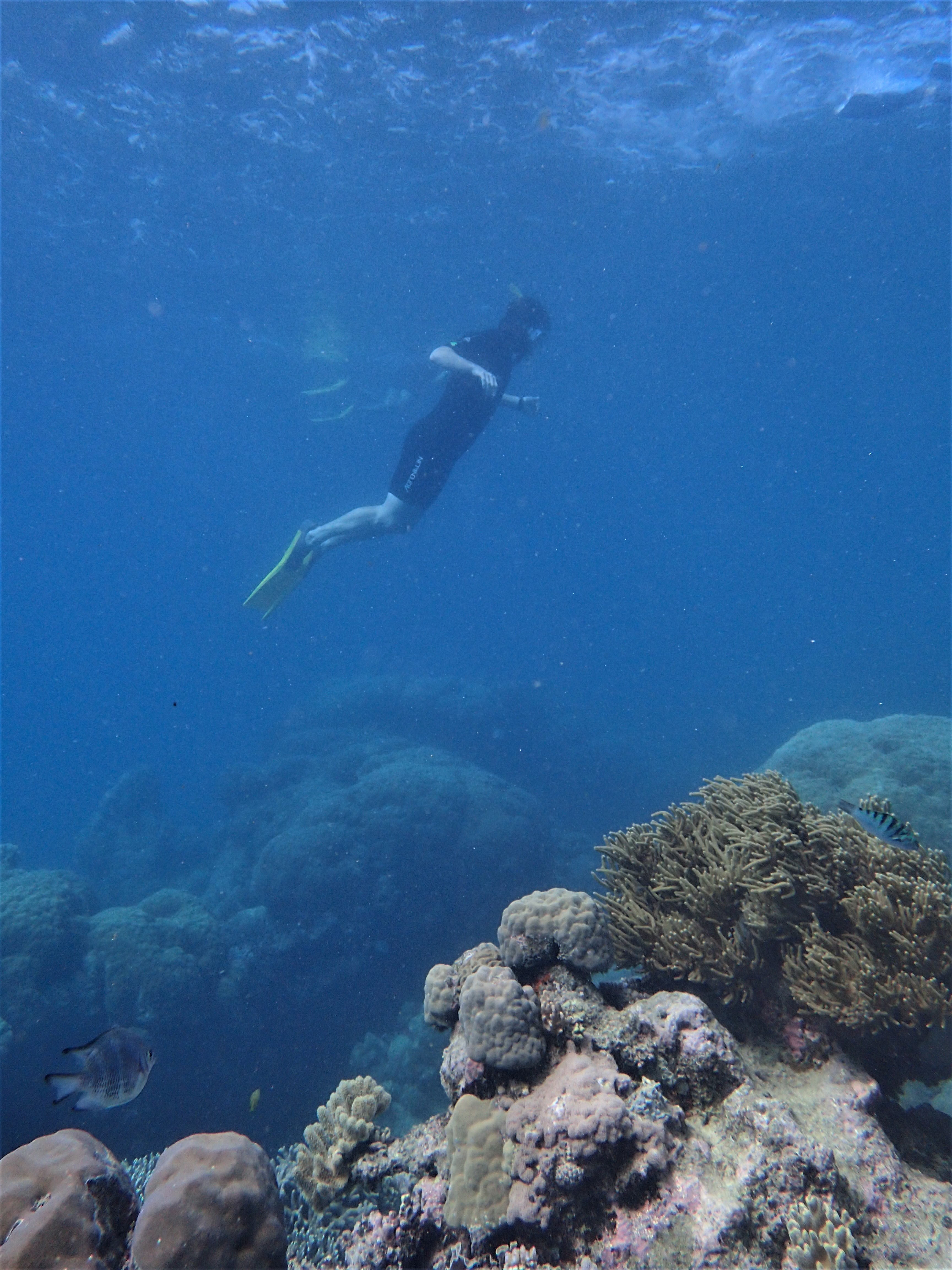 Floating in the water over coral stacks around 20 feet tall watching a cloud of tiny blue and orange fish darting around my hands, I forget what it took to get here. All I can think of is how mesmerizing this view is, I want to remember it clearly. The sun has been in and out, and when it strikes the water, the fish and the coral are illuminated. Fish are sparks of color on the mossy brown coral.