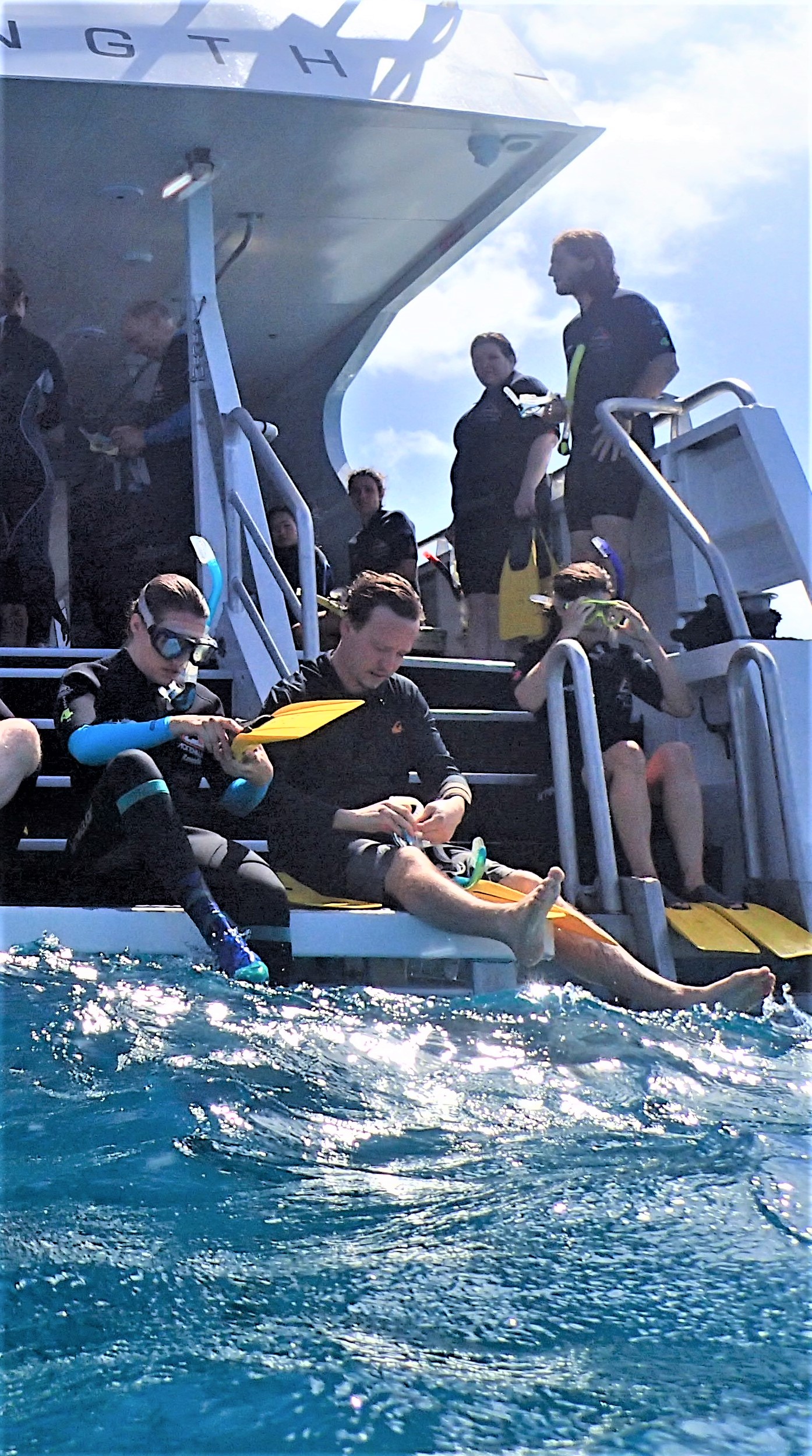 Amanda and Jim arrived in Australia on Sunday–we saved this adventure for their visit so that Amanda could use her skills as a marine biologist to point things out to us. They were among the first into the water. We suited up and flopped in, taking pool noodles for a little extra support.