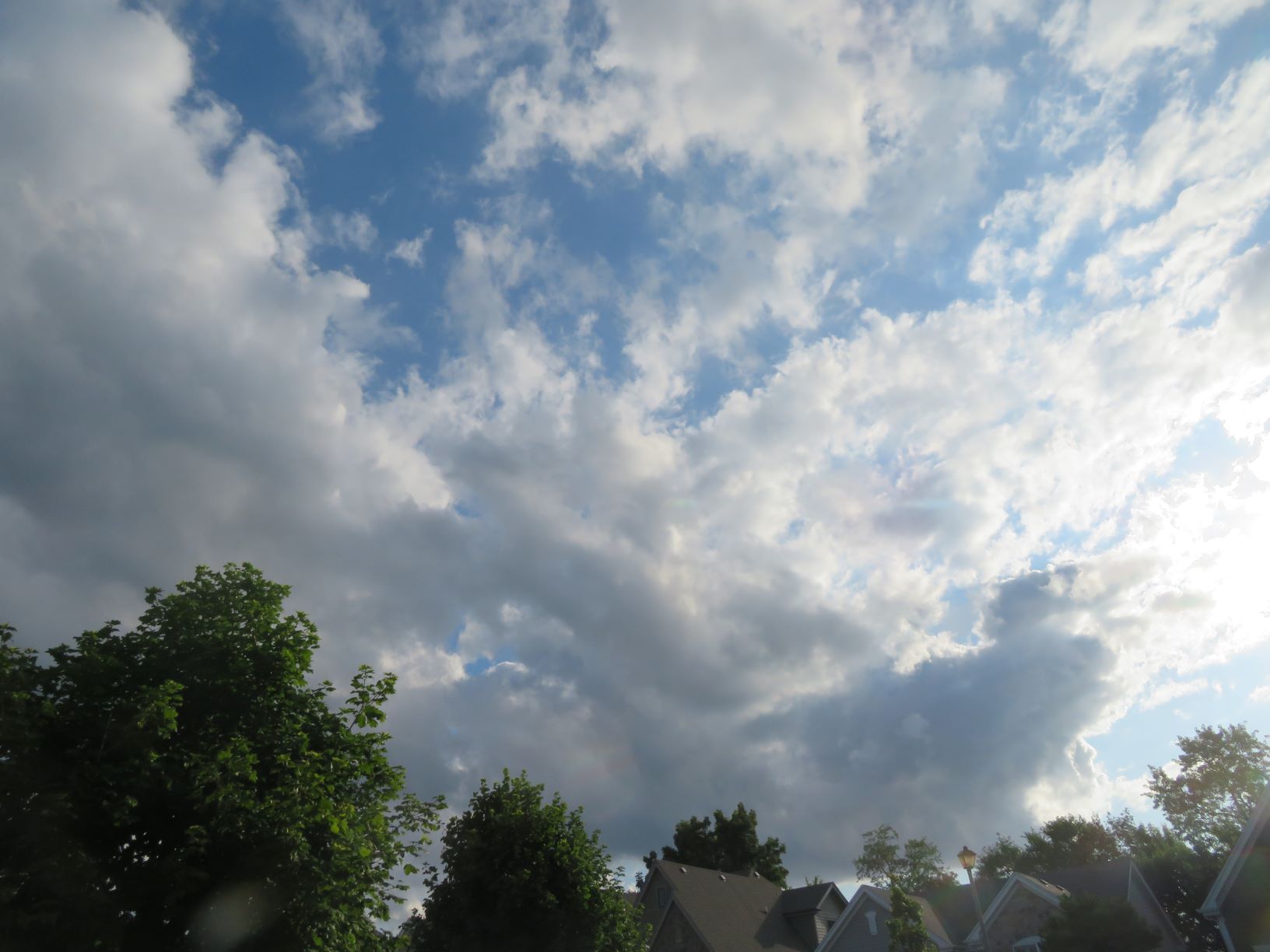 Days have been sunny and warm, in the 80s (since the Heat Dome subsided). The sky may be completely blue, or covered with clouds. I discovered it’s difficult to photograph the sky in the suburbs–there are a lot of wires, towers, and light poles.