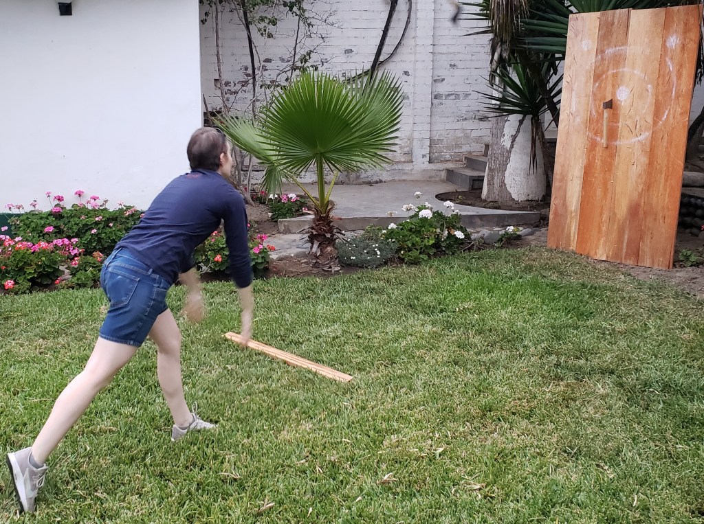 Everyone brought their skills to the party, too. Jim nailed the fabric backing onto the loveseat where the tacking was giving out. Neil consulted on the wifi system, though it doesn’t look like we would benefit from a mesh upgrade. Lillian reset our connection to the printer, and fixed Jim’s constant resetting after a messed up update. She also made the Christmas squid. Amanda spent her down time knitting, turning out half a hat while she was with us. Jonathan ordered a pair of throwing axes after seeing pictures of an axe throwing adventure and set up an axe-throwing target in the back yard. Lyra threw axes most every day. The group enjoyed trying it out, but Lyra became a pro.