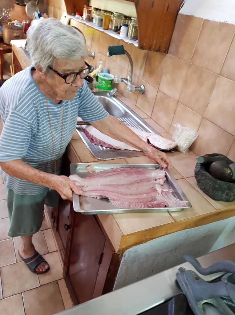 Ceviche is one of the most important beach dishes, central to our family parties. Though Jonathan is adept at filleting fish and making ceviche, we had the chance to get our neighbor Teresa to make the ceviche, using her many, many years of experience… The freshest fish you can get is mixed with finely sliced arnaucho hot chili peppers, fresh lime juice and accompanied by pieces of Peruvian corn on the cob, or choclo. It’s not what Americans would recognize as corn on the cob, the kernels are large and white, and the flavor is not sweet. Ceviche also comes with pieces of sweet potato, boiled, then cooled. Lots of finely sliced raw onion (soaked in salted water) completes the dish.