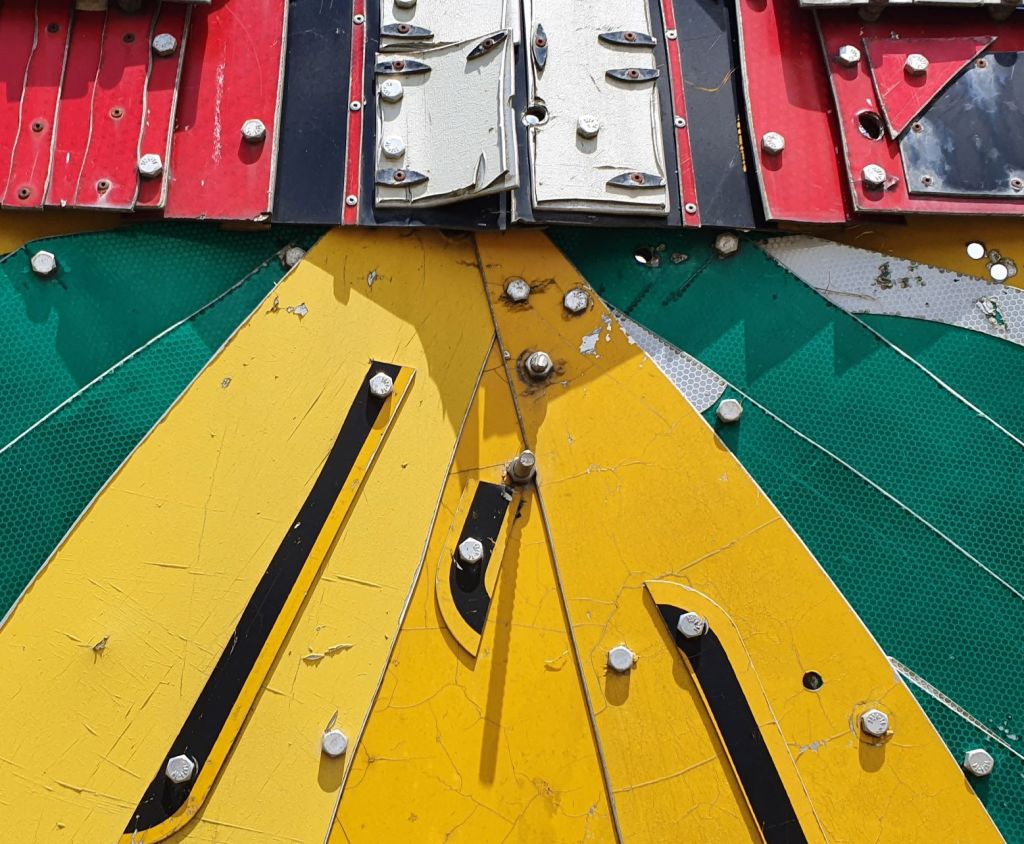 Knock-your-socks-off effort went into making the mural, yet there is no onsite information about this extensive installation. Fortunately, the Uncovering PA website tells the story. Led by a professor from Allegheny College, the sculptures and mural were designed in 2000 and built over ten years, with lots of inspiration and suggestions from students and local residents. So many signs, so many bolts! The material, old road signs, means this is a heck of a durable piece.