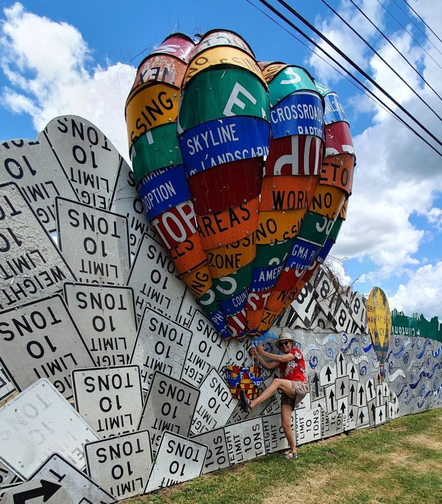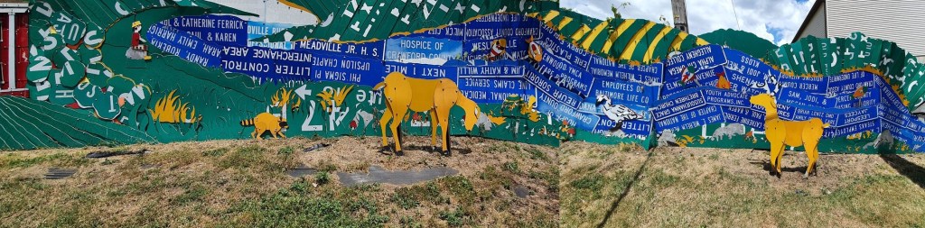 Our current home is just a couple of miles from the Pennsylvania border. In the town of Meadville is the amazing PennDOT Crawford County office. There’s a garden of oversized Seussian flowers and plants on the corner by the stoplight. Along the side of the depot is a remarkable mural panorama of Pennsylvania icons. The mural is bolted to chain-link fencing extending down the road for hundreds of yards. A steady trickle of people visit. No one was there when we arrived, then a couple stopped, took a photo and left. We walked down the edge of the highway looking at the mural, and when we returned to the parking lot, a family was exploring the sculptures.