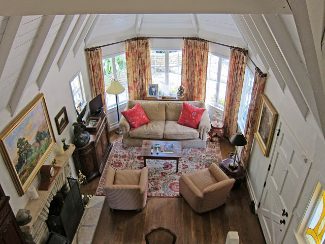 Comstock influenced interiors, as well. Fireplaces are part of the look, since once they were the main heating source for small cottages. His interiors were untreated board and batten, painted or unpainted, and ceilings had exposed beams. This is a legacy of California climate, too, where houses were not generally insulated. Ask any Eastern transplant about their first winter in California, getting out of bed to find their home ice-cold with only a tiny wall space heater in the bathroom battling the chill. No wonder so many people go outdoors and run!