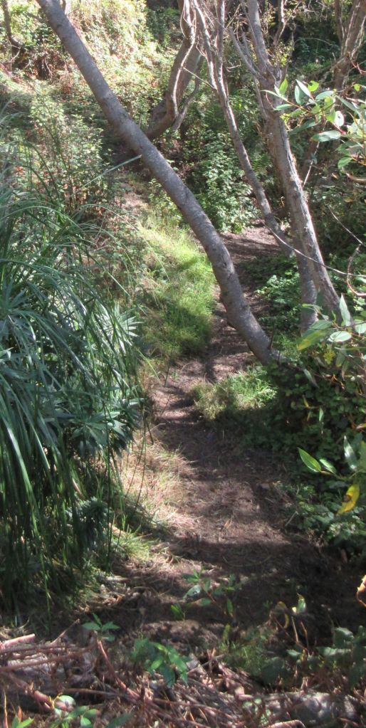 In the next neighborhood to the south, off Yankee Point Drive, there is no access to Yankee Point, despite the name. At the very south end of the street, though, we found a narrow coastal access trail that leads to a tiny beach at the mouth of Malpaso Creek. There are a few places for cars to park on the street, too. We were so pleased at having found a hidden coastal access point that we walked down to have a look. The trail has a beautiful overlook of the inlet, one trail to the beach, and another into the woods upstream for a short distance. Highway One passes overhead on a high concrete bridge, yet under its span is a patch of woodland with good birdwatching, and toward the end of the trail about a quarter mile in, there’s a tiny stand of redwoods.
