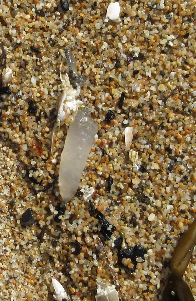I poked a lot of limp sea creatures this week. It turns out that pieces of jellyfish that wash up on the shore look a lot like beach glass. Some bits of jellyfish are perfectly transparent and shimmer like crystal under the sun, while others are cloudy and frosted-looking, like nicely rounded beach glass. My efforts were rewarded, despite those icky experiences, because we found a lot of interesting glass and pottery on the beach.
