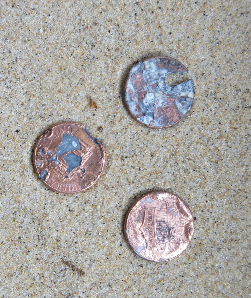 On the way back, Jonathan added to my collection of beach pennies. I’m not sure what happens to pennies once they start rolling around in seawater, but the surface erodes and the copper surface peels and bubbles. I haven’t been spending much actual cash, so I still have all three. I’m not sure anyone would take them, even CoinStar.