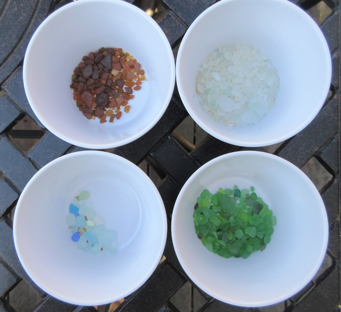 A few hours of beach combing is hard on the knees and the back, so on the second low tide of three in a row, we made a much shorter visit to McAbee beach. We’ve visited before and noticed that there is a lot of very small beach glass in the sand. Rather than spending a lot of time stooping and peering, we took a plastic bag and collected about 2 quarts of sand from an area that seemed to have a lot of small pieces. Once we got it home, we could search the sand for tiny pieces of glass. I have been using these to make earrings filled with mini beach glass, filling little bottles and vials with colored pieces. I had been crushing glass bits to fill some extra-tiny vials, but that is both a bit of a mess and more time consuming than you’d think. My new collection of itty-bitty pebbles of beach glass will let me make as many little bottles of glass as I want. I’ll go back to making larger items after that. (Click the link in the side bar of this post to visit the Etsy site where I post the beach glass jewelry I make.)