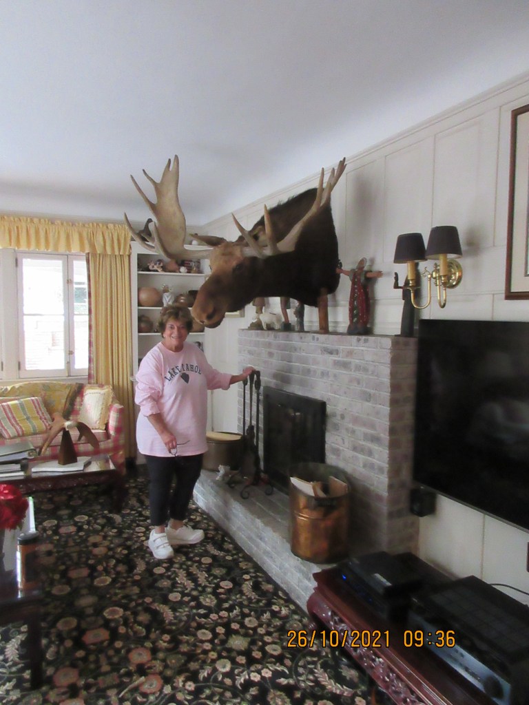 The month wasn’t over yet. From Syracuse, I drove through a downpour to Nyack to visit archaeology friends. The rain didn’t bother me particularly, as traffic was light and the roads were not flooded. I got to see the Adirondacks full of rushing streams. Dave and Lori live in a wonderful old house, carefully restored by Dave over the years, and full of remarkable things they’ve collected. I turned to look into a sitting room and burst out laughing. “I haven’t seen a stuffed head that big since Hemingway’s house in Cuba!,” I choked out. Lori assures me that the moose died a natural death (really). I think it’s almost as tall as she is.