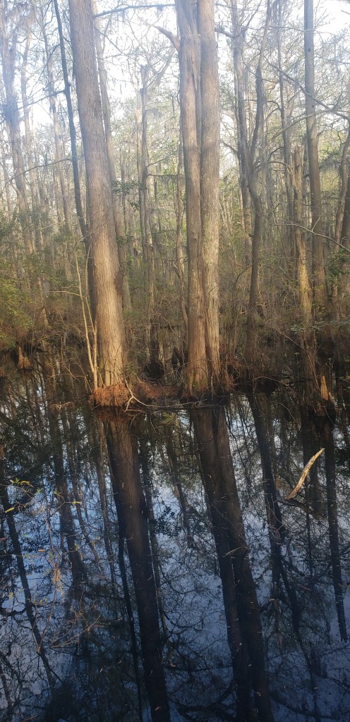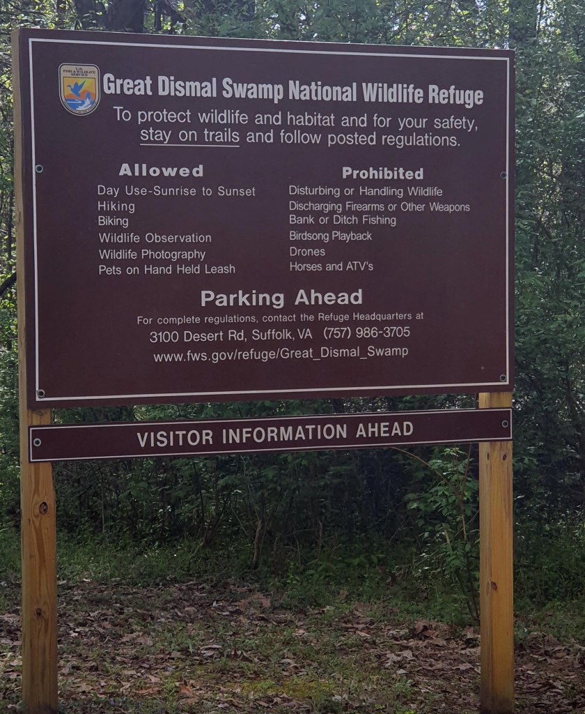 Next on our itinerary came Great Dismal Swamp. With a name like that, I knew we had to visit. We headed to the area recommended for bird watching, walking a section of Jericho Lane, and the brushy sides of the road were perfect warbler habitat. Several different species sang and hopped in front of us, along with kinglets and cedar waxwings. The sun was out, it was relatively warm, and not at all dismal.