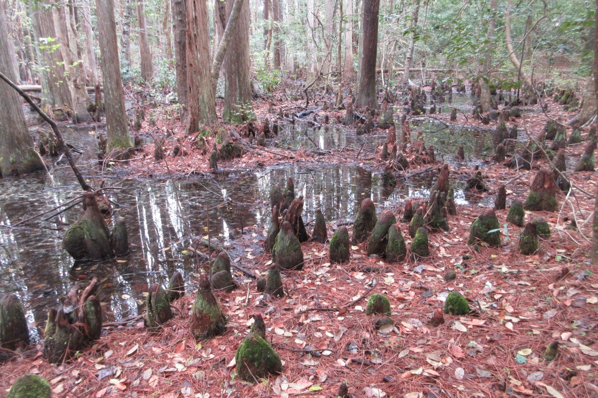 We don’t even have to get in the car to visit First Landing, as our street dead ends at the park’s eastern edge. We walked west into the park along raised ridges that head across the park toward the water. The area was drained and logged in the early 20th century but is now overgrown with secondary forest. We didn’t see many birds, but the forest is beautiful, with cypress knees growing in the low spots, and extravagant fungi sprouting from fallen logs.