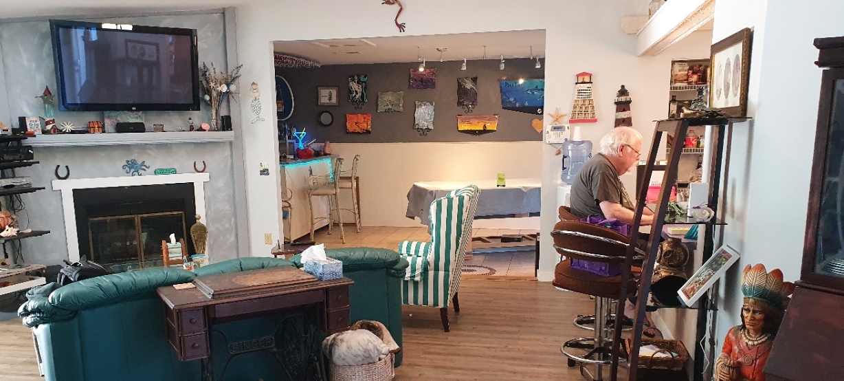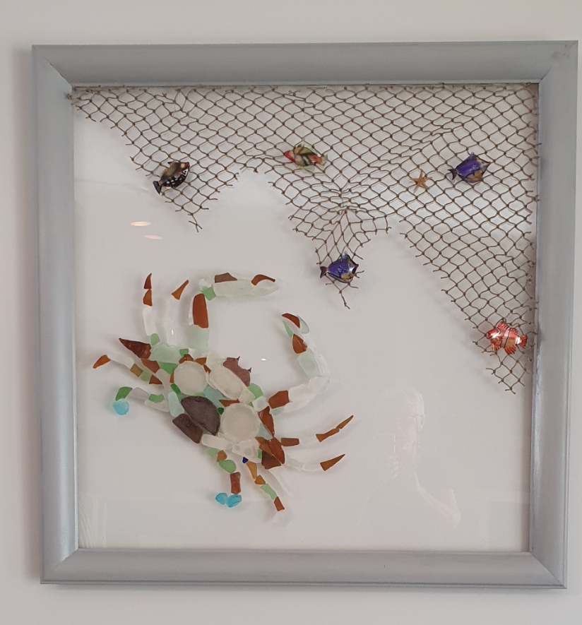 On Sunday, we made the drive from Virginia Beach, VA to Wilmington, NC. It’s a 4 1/2 hour drive according to Googlemaps, but we stop a bit more frequently than it does. We were settled in our new house by the end of the day. It’s the most playful place we’ve ever stayed. The space that might be a dining room has a bar and pool table. The sun room is an art studio. The bedrooms are colorful and full of seaside decor. There’s even a swimming pool in the back yard. It’s not very big, but it’s very nice, with chairs, table with umbrella, and a little pool house. The property backs on an undeveloped overgrown forested area, and lots of birds sing in the trees. A bluebird is nesting in the box in the yard, and I think the eggs are about to hatch. I’m looking forward to seeing baby birds.
