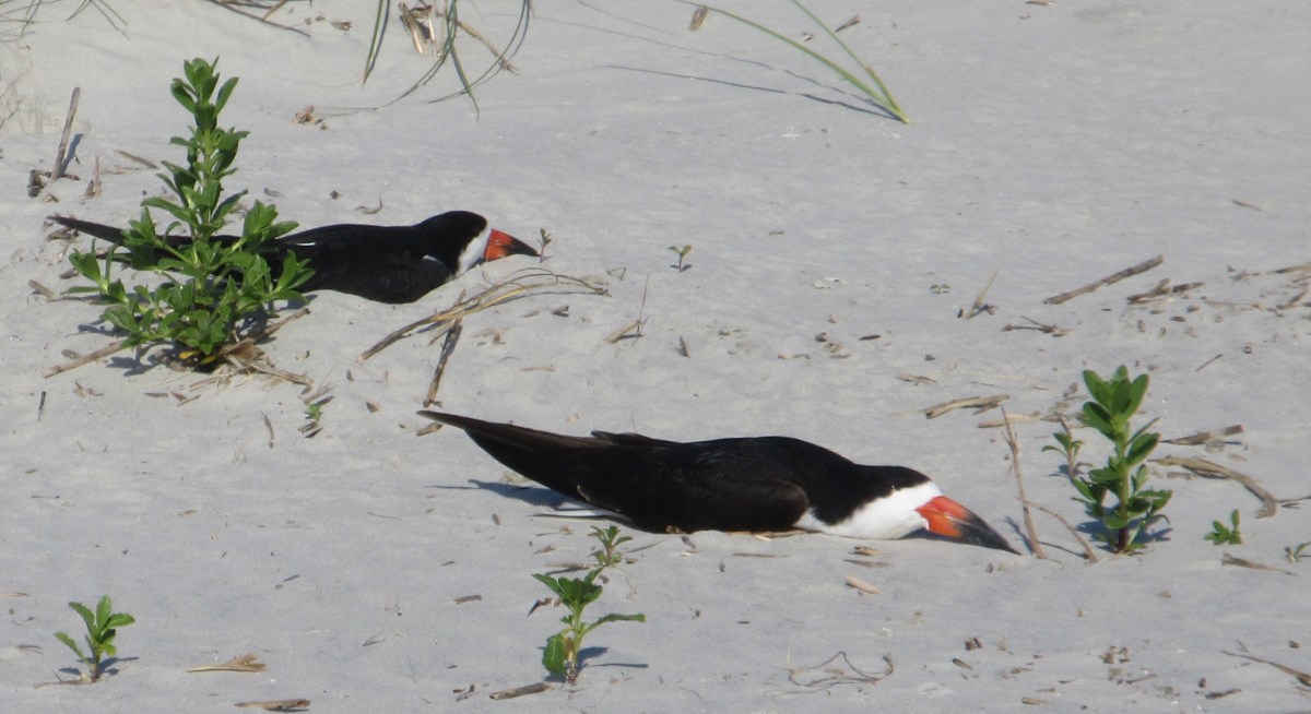 Our first lesson in living here arrived in Wrightsville. All parking is limited and expensive here. Where there is a moderate amount of free parking in the neighborhoods of Virginia Beach, and beach access at the end of every street, beaches in this area do not want visitors. Lots of the shoreline is accessible only to land owners, and parking is metered and closely monitored, $5/hour or $25/day. If that isn’t discouraging, there’s a “convenience fee” added to your parking payment, so in fact it costs more than the hourly/daily rates. We figure we’ll spend between $100-$200 on beach parking in a month. Who knew? On the bright side, the phone app lets you add time from a distance if you decide you need one more hour. Wrightsville Beach was lovely. We spent our time at the far southern end of the beach, strolling and beachcombing and watching the nesting skimmers, and least terns. My favorite image was the skimmer lying on its nest like an exhausted dog, neck stretched out–a mom, perhaps, trying to catch a break.