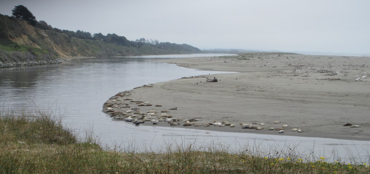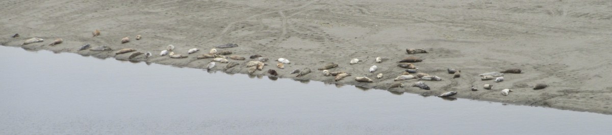 In northern California, there are lots of new places for us to visit. The only limit to how much of the shore we see is how long we can keep walking. We had to make a stop at the Arcata-Eureka Airport. I looked for a place nearby for a walk and found Letz Ave., right across from the airport turnoff. We drove north as far as it went, then parked. The Hammond Trail passes by the parking area and we headed north past another parking spot, Vista Point, where you can see out over the mouth of the Mad River. The river has worn a channel parallel to the shore for over three miles before making its way to the ocean, creating a narrow island. The island’s end at the river mouth is quite remote. We could see across the narrow span of water, but it’s only accessible from far to the south. The tip of the peninsula is quiet, serene, and empty, except for the seals.