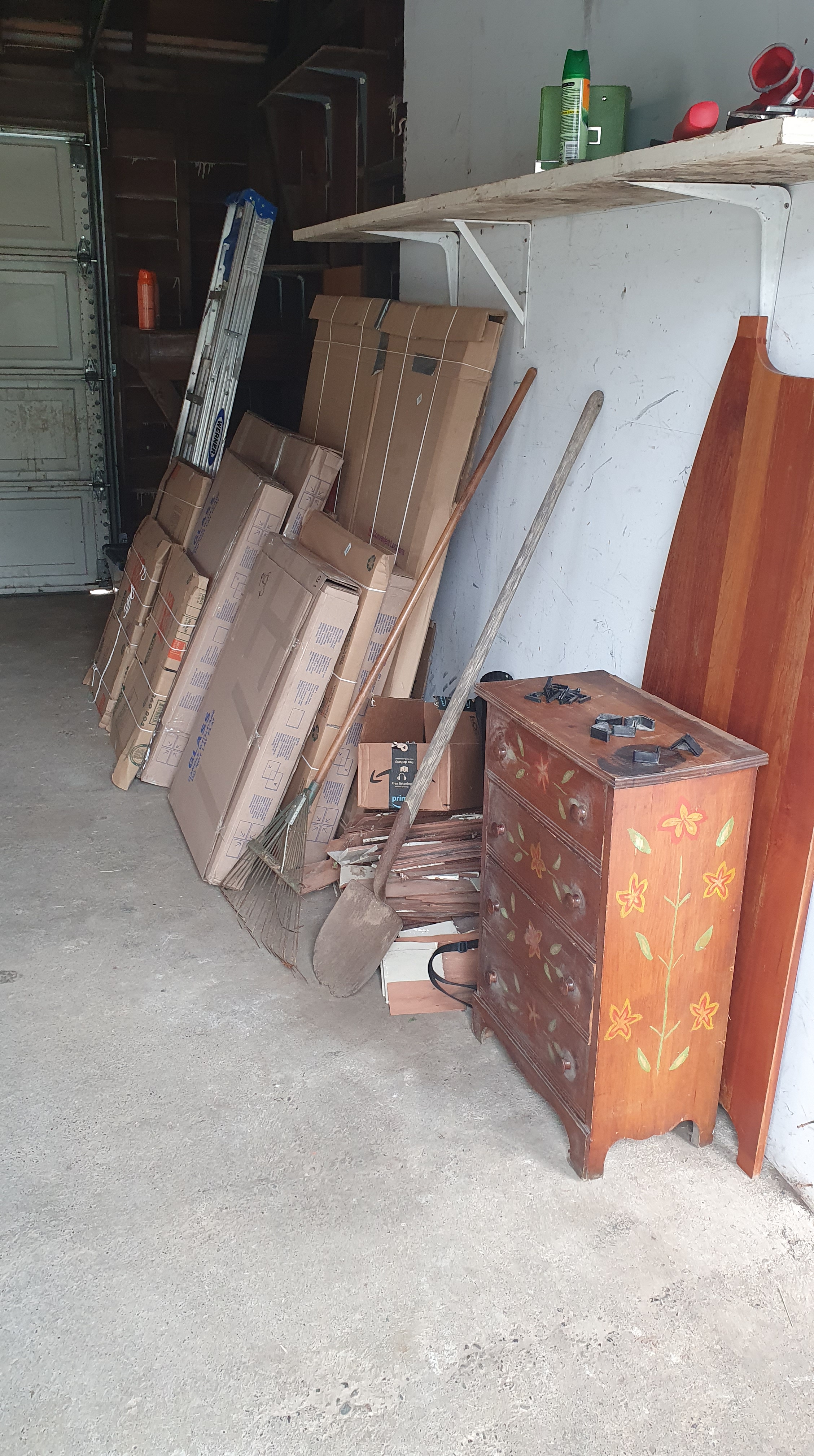 Our driver, Ralph (probably Rafael), arrived at 9 am Monday morning with two assistants. After looking over the possibilities, he pulled the immense moving van (over 70 ft long) across the end of our alley, and the guys hauled our boxes to the garage, avoiding the stairs between the street and the front door. It took about a half hour just for them to maneuver the contents inside the van to extract our boxes. From that point, the delivery went rapidly. By noon, all the boxes were piled in our garage, and the storage shelves disassembled by the packers in Illinois were put back together.