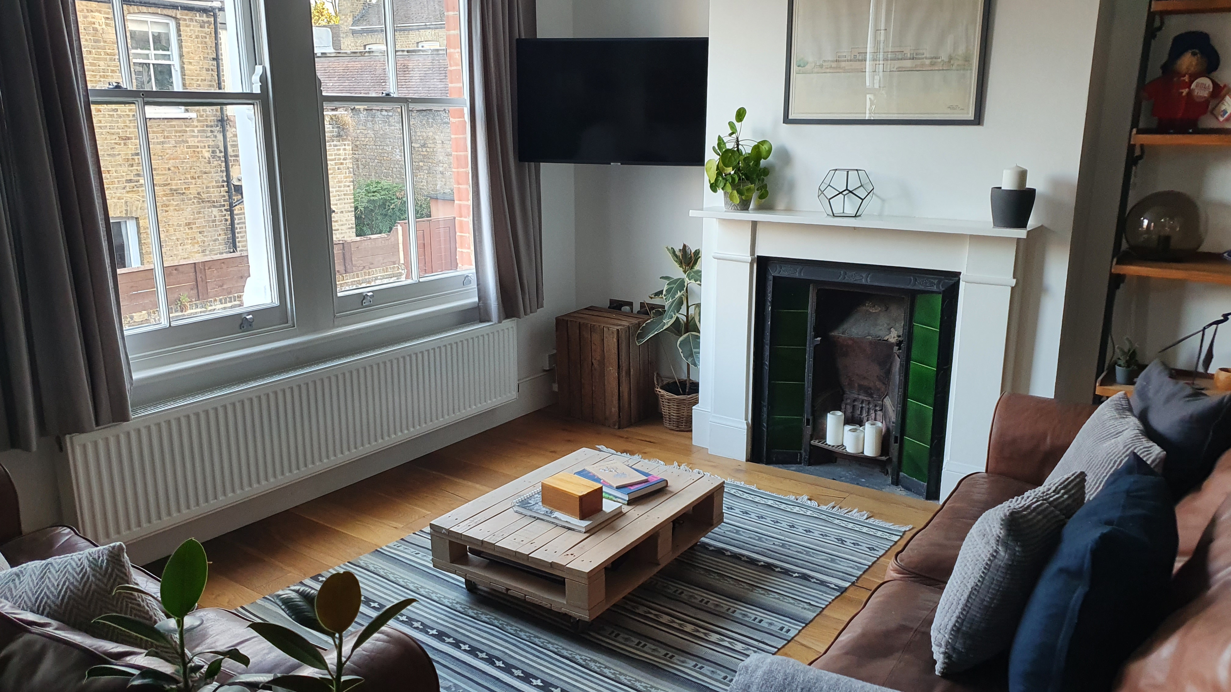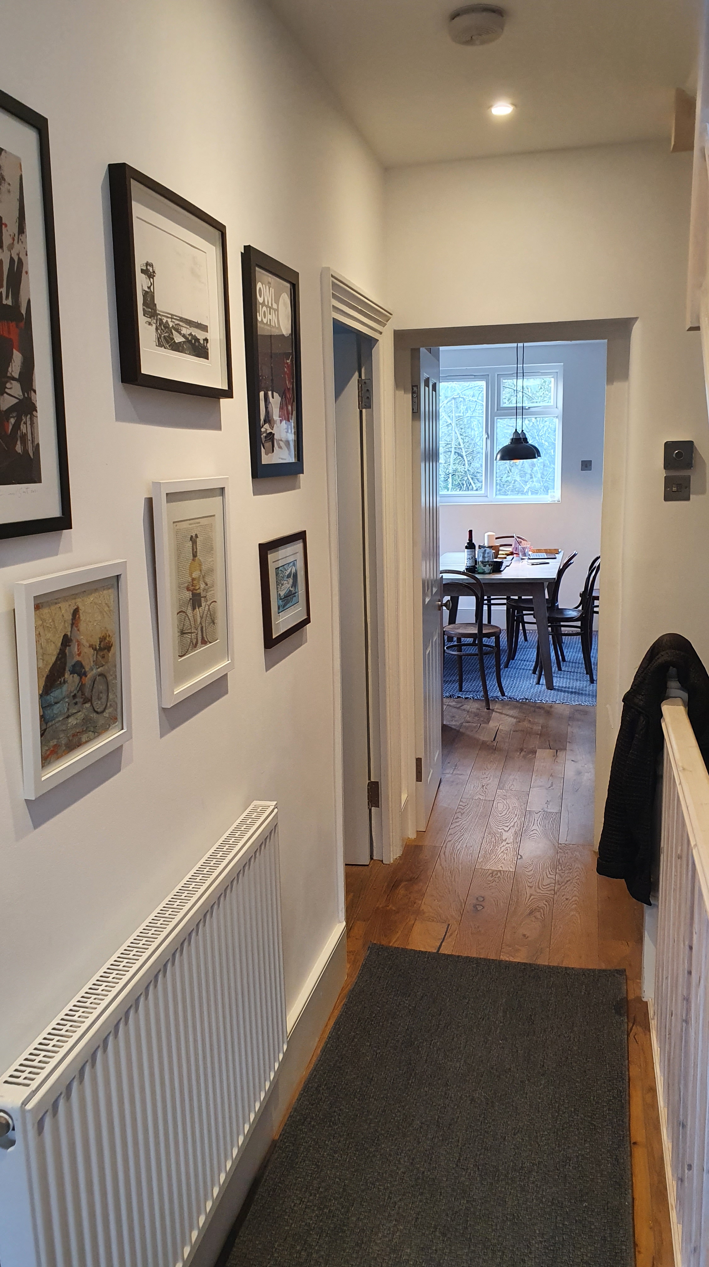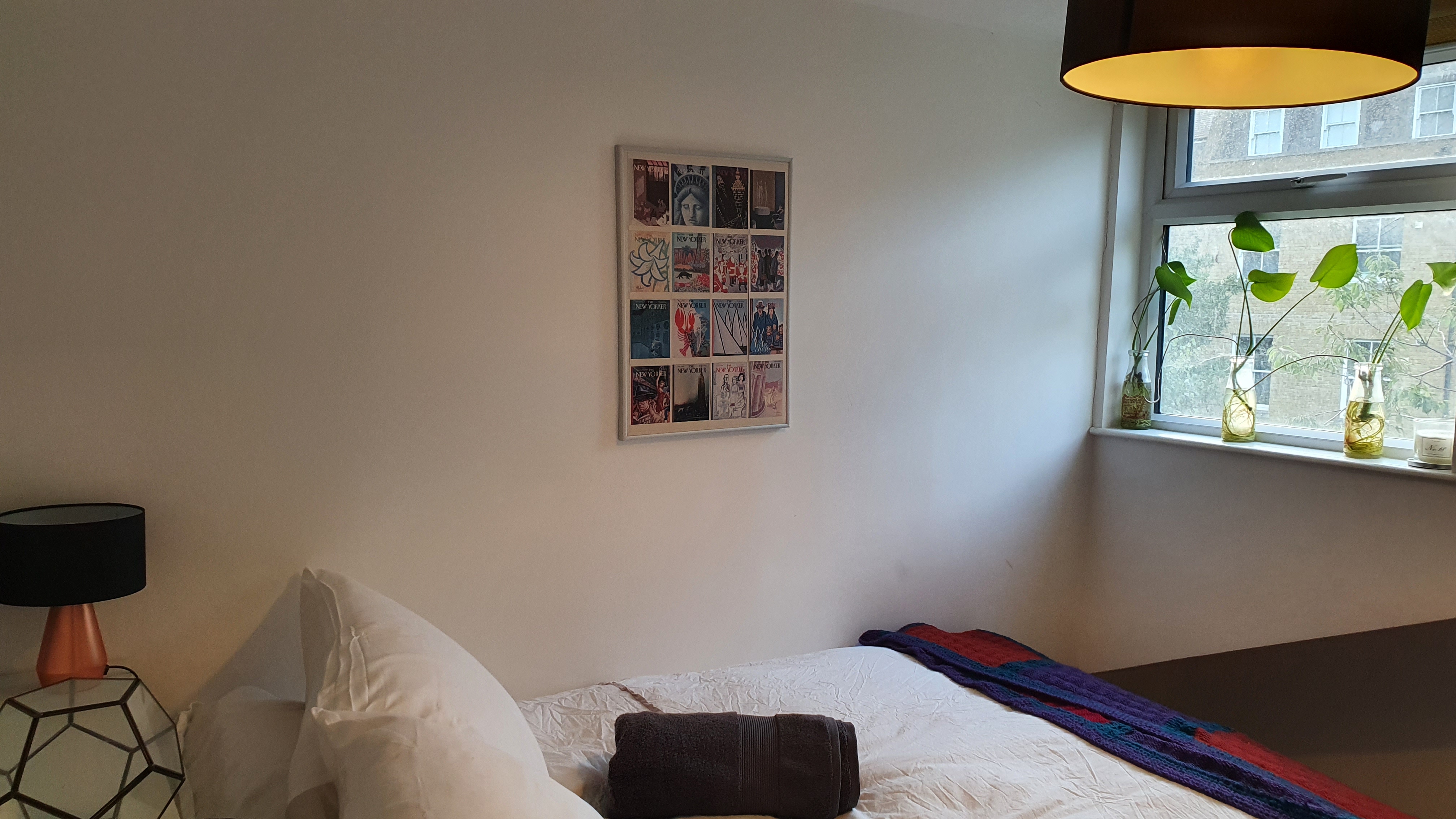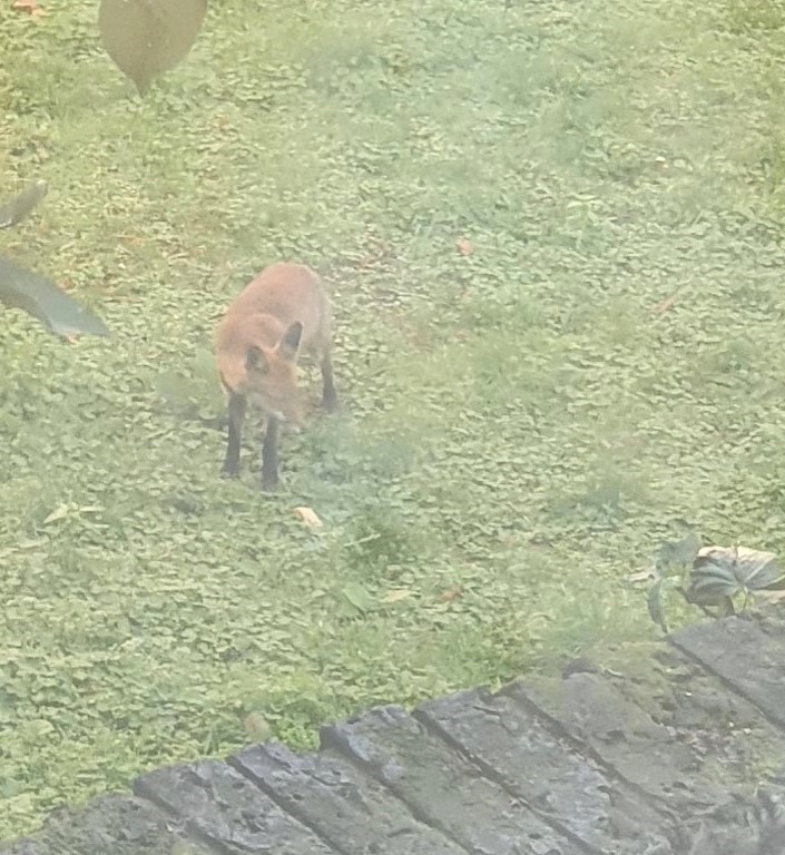 The kitchen is made for cooking, with a large range, all the cookware Jonathan needs, and a full-size fridge. It also has the dining table (photo is at the top of this post). Heat and hot water work very well, and the house gets nice light from windows over the street in the living room, and kitchen windows over the back garden. We hear a few birds in the trees, but haven’t seen any. Our first morning, I looked out the garden window and watched a fox prowling on the lawn. It’s definitely a city dweller, as there’s is not much in the way of woods for quite a distance.