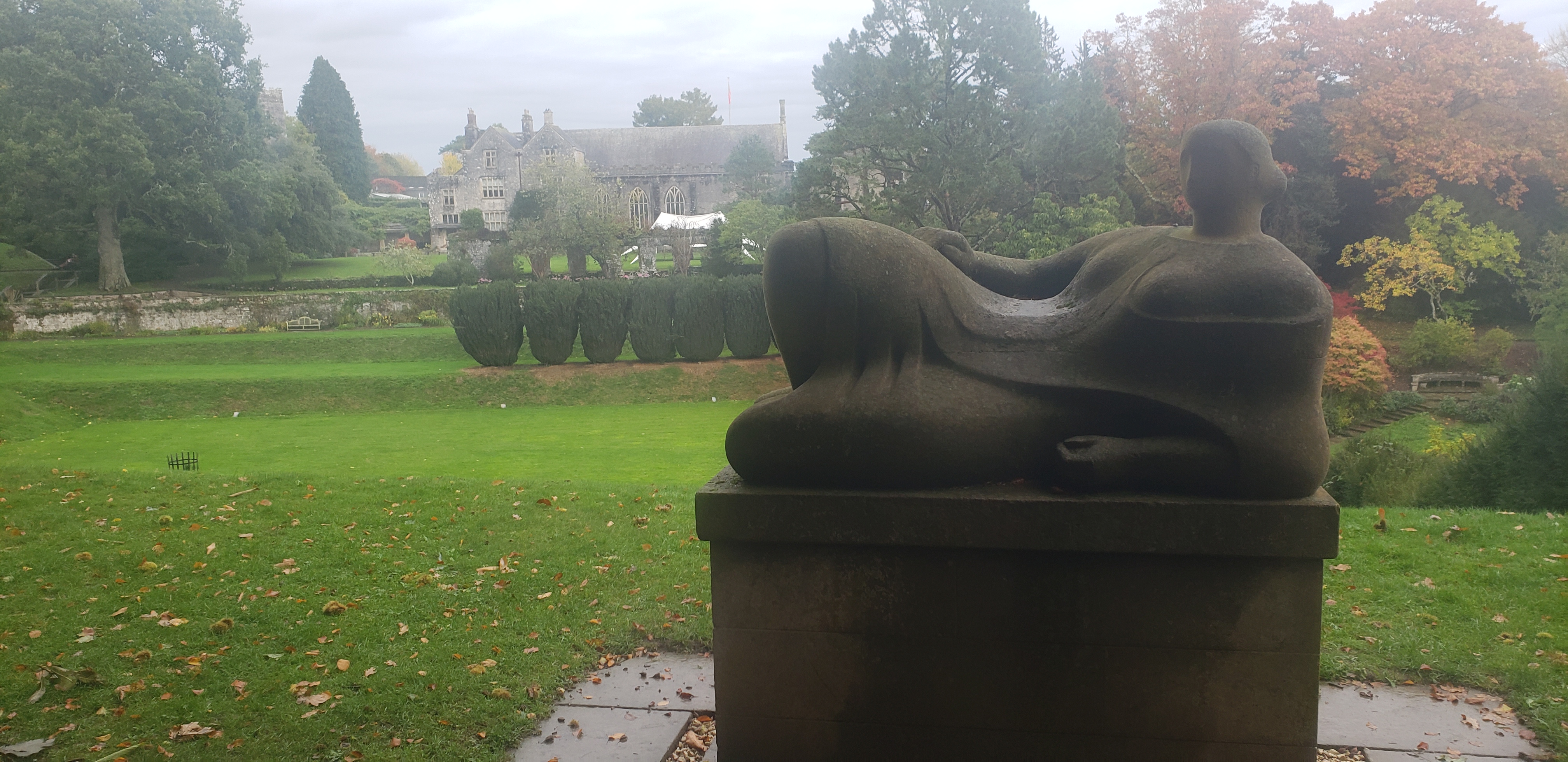 From the train, we went to visit the Dartington Trust Gardens, a beautiful property. We strolled the path to a high point where an early work by Henry Moore is positioned overlooking the grounds. The area below is called The Tiltyards, and as the path winds toward them we stopped at the whispering circle. This walled perfect half-circle allows a person to stand in the center and hear their own voice amplified. We ambled past a number of buildings, studios for artist residencies, and rental rooms for visitors. Dartington also produces fine crystal. After we returned to London, I discovered that my favorite glass in our rental house is Dartington.