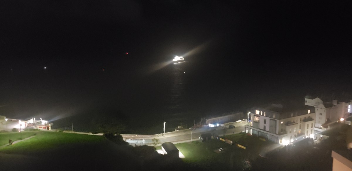 We had a splendid dinner at Everest Spice in Plymouth, then fell into bed. The view from the apartment out over Plymouth Harbor is mesmerizing, night or day. Ferries to France and Spain leave from the wharf just below the hill. The overnight ferry leaves after dark and lights up the bay before it sails.