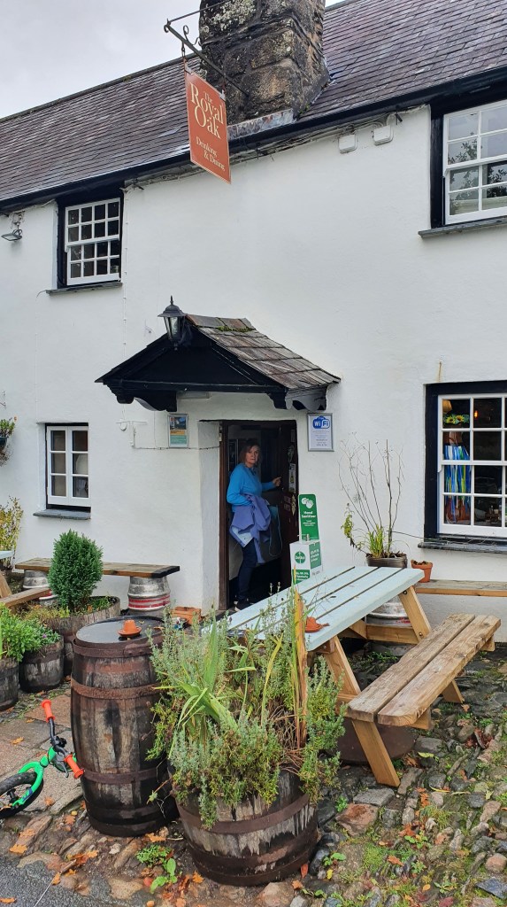 After our stroll in the Barbican**, we drove out of town to have lunch at the Royal Oaks, in Maevy, on the edge of Dartmoor, the vast national park of grasslands and forest. There are open grasslands, bog areas, and woodlands. On a bright autumn afternoon, it was not nearly as threatening as in The Hound of the Baskervilles. A pub lunch is always fun. I was a bit concerned that my glass of cider would make me want to take a nap rather than continue on our exploration, but it was a very small glass.
