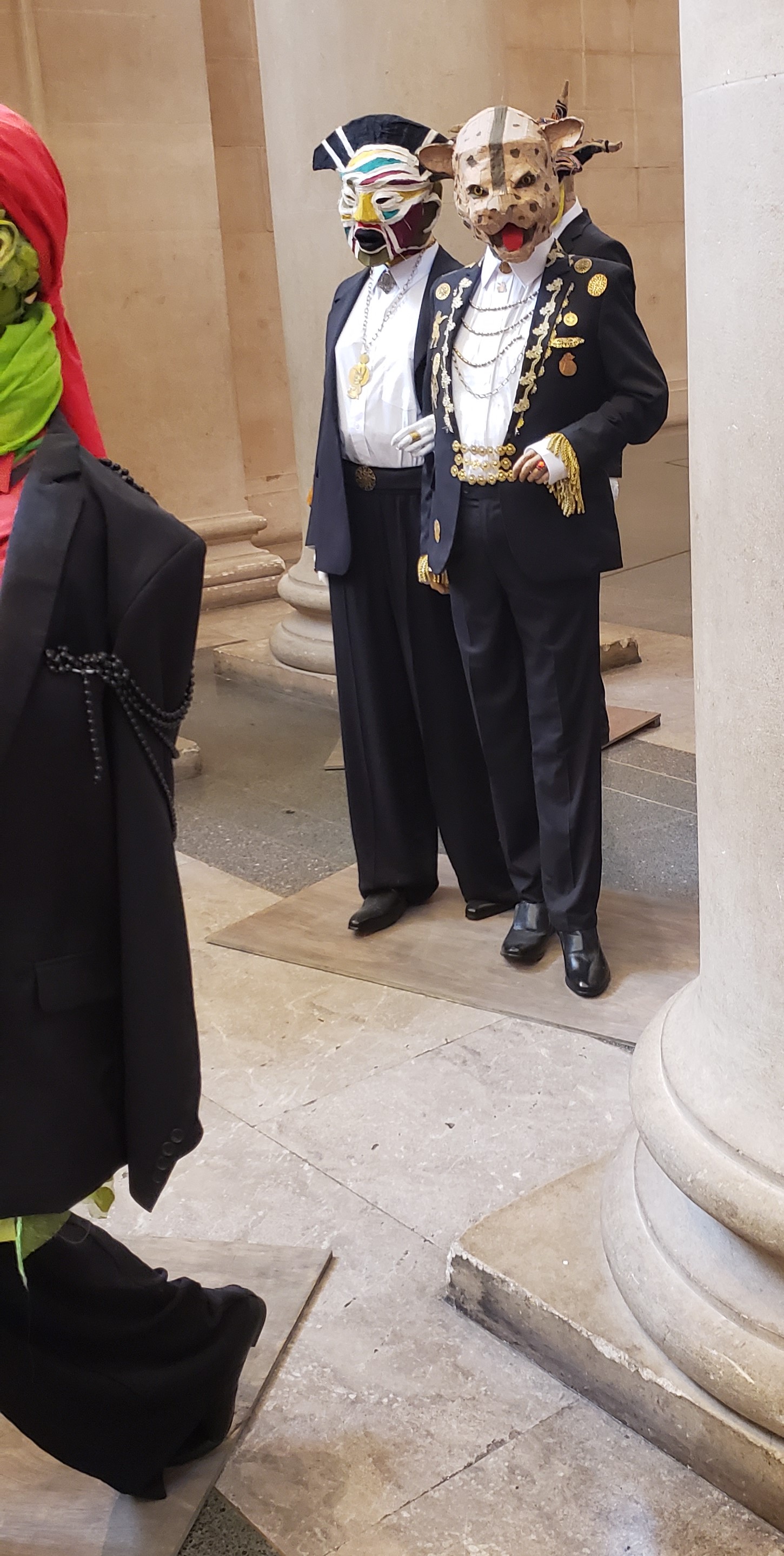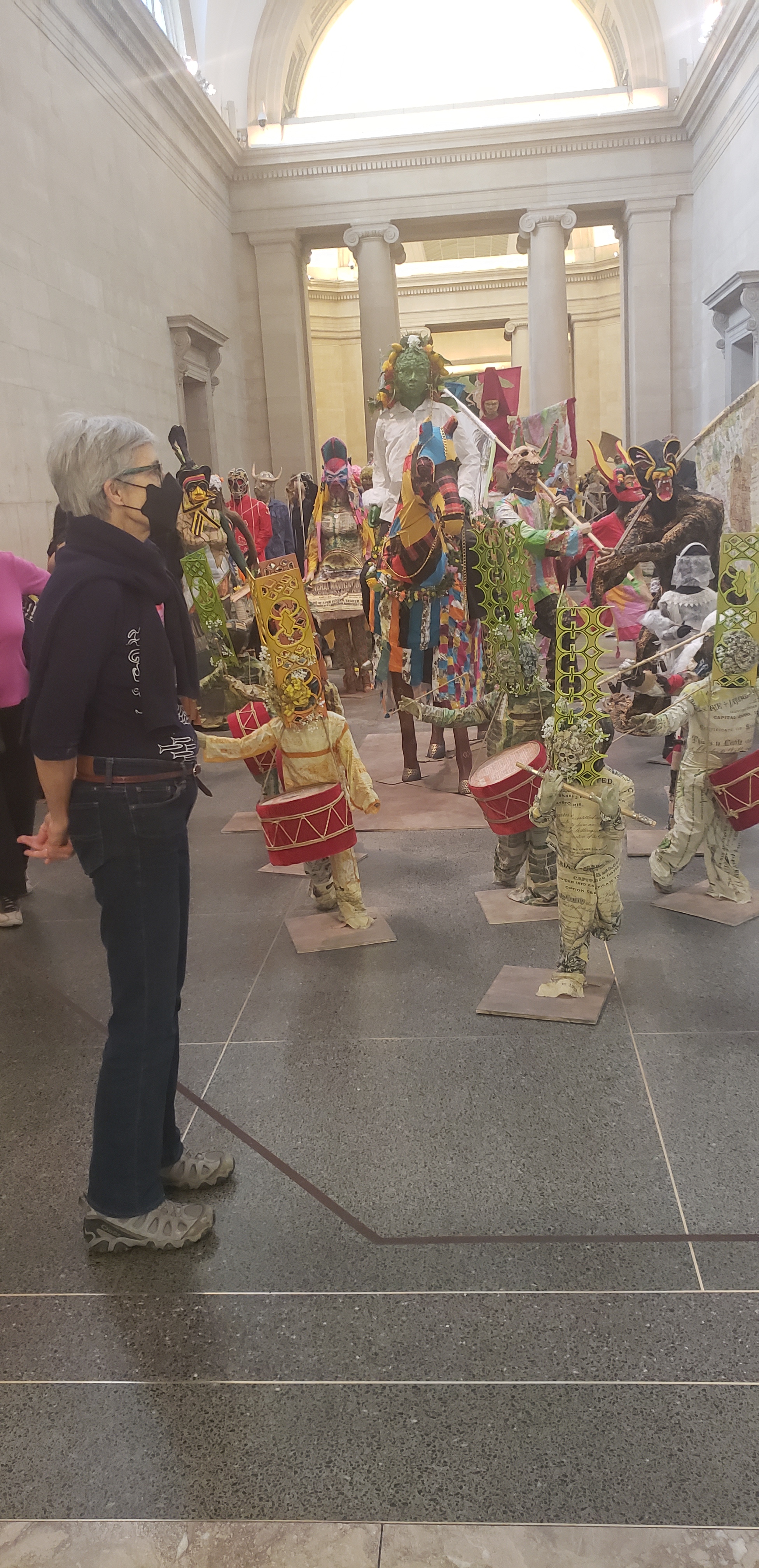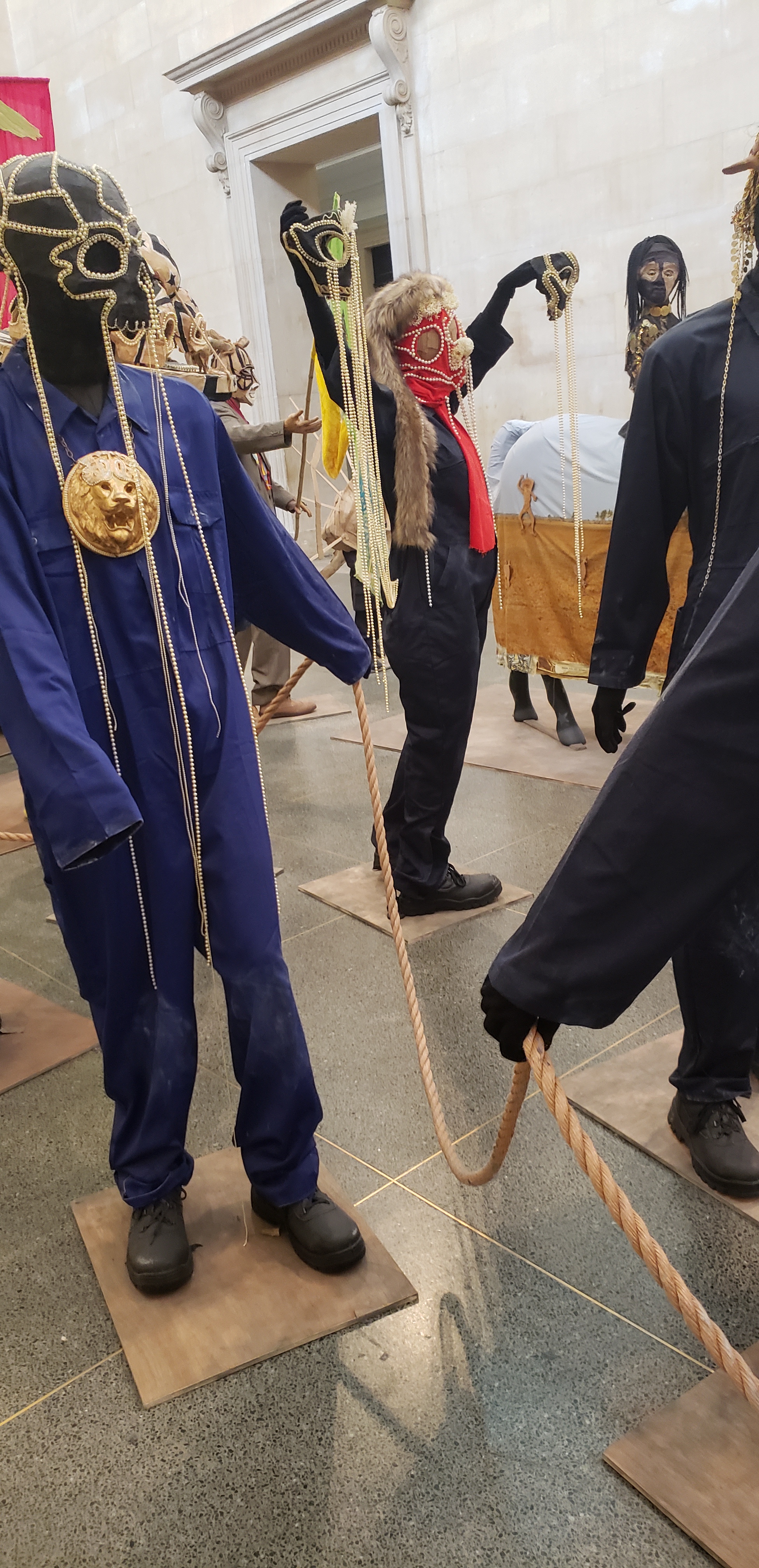 What struck us most strongly at the Tate Britain is the 2022 commission by sculptor Hew Lock, The Procession. It looks like a frozen parade, spilling out of rooms and down the main hallway. On closer examination, it is not a Mardi Gras celebration, but an elaborate allegory of colonialism and related themes. So many hints are embedded in the pieces that there are guides to indicate the numerous veiled references. (Jonathan’s comment was that conserving such an extensive group of objects would be an epic curatorial challenge.)