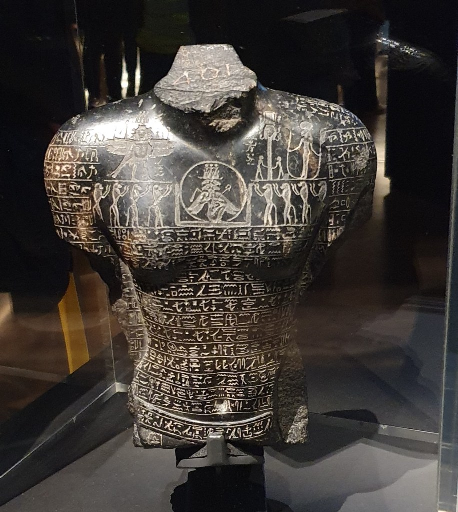 The British Museum’s featured exhibit right now is on Hieroglyphs, featuring the Rosetta Stone. There were lots and lots of inscriptions, and discussion of how hieroglyphs came to be translated by Champollion and Englishman Thomas Young. A torso of a man covered with hieroglyphs reminded me of a young person covered with tattoos.