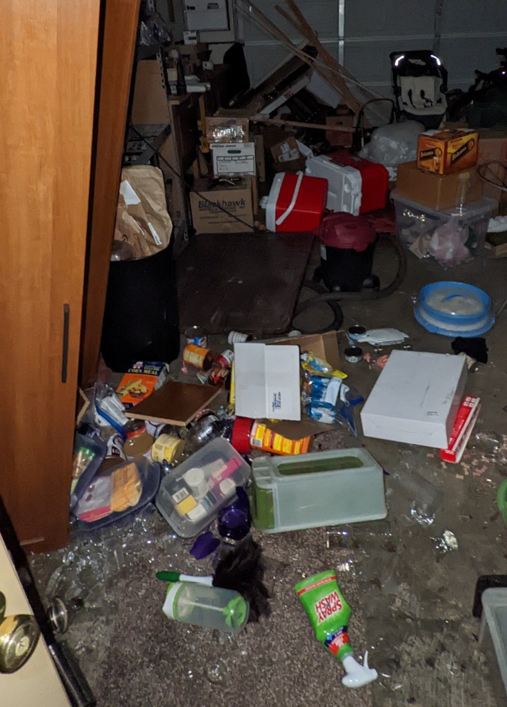 The garage was full of crushed glass from the cabinet of wine glasses and flower vases. Jim worked on picking up fallen cans of paint, oil, and piles of wood, then he and Jonathan swept up glass fragments.