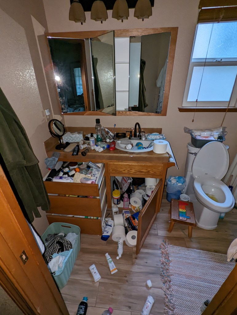 The kitchen was covered with broken glass and the remnants of a bottle of cooking oil. First, we picked up and swept up glass, then Lyra went over it with degreaser and we could finally walk across the room safely. Others restored order to the bathrooms and bedrooms, and started in on cleaning up the sunroom, where a number of plant pots had crunched on the tile and needed repotting as well as cleanup. Little by little the mess receded.