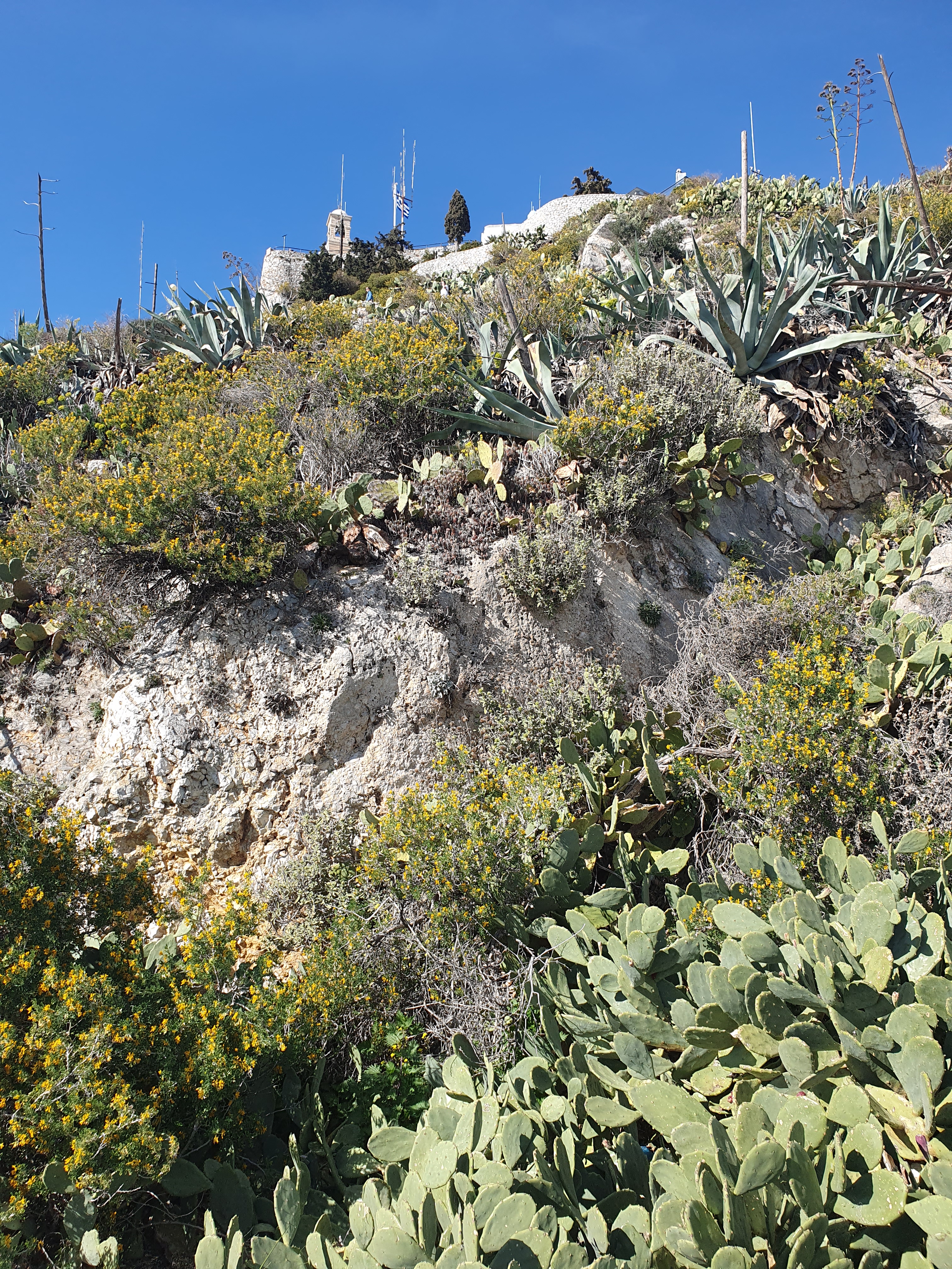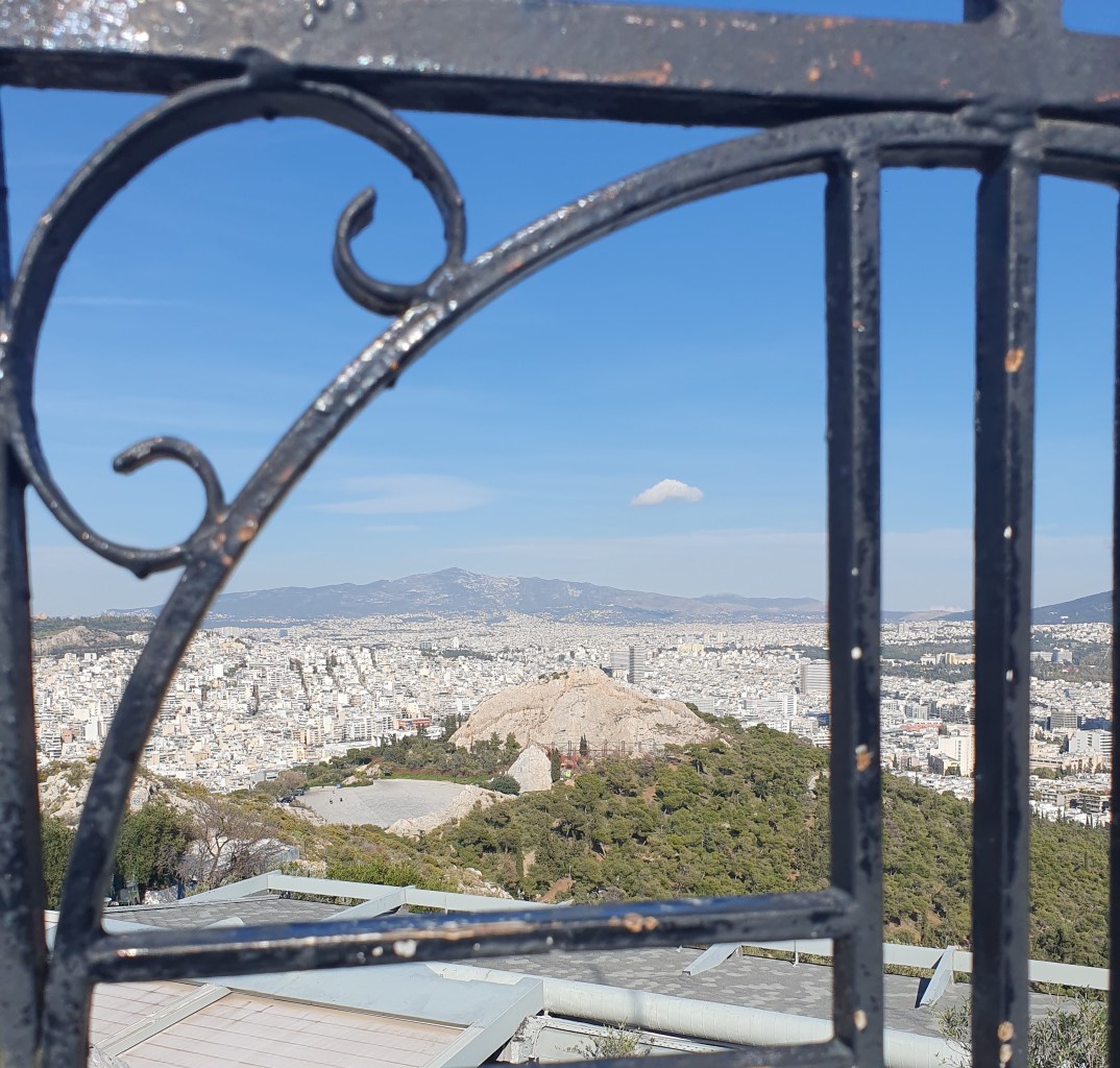 It was a sunny day and Jonathan was resting his knees, so I went for a stroll up Lycabettus, the hill we can see from our terrace. Our view is blocked in part by a large communications antenna, but on the walk over, I could see the hill very clearly. It’s the highest point in Athens, about 900 ft above sea level, and offers views in all directions over the city.