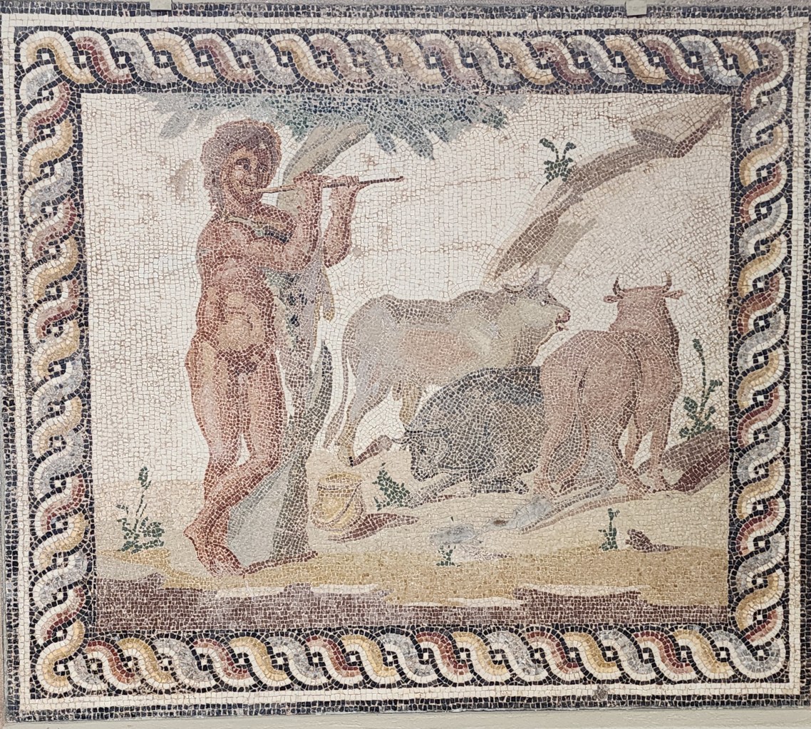 Corinth minted coins, developed the trireme (widely used ship on the Mediterranean in ancient times), and was known for it’s decorated pottery. The setting is distinctive, with the city on a broad plain with a high hill in the distance. Corinth became a province of Rome during the first centuries AD, and on top of all the Greek settlement were Roman villas with elaborate mosaic floors, baths, and more temples.