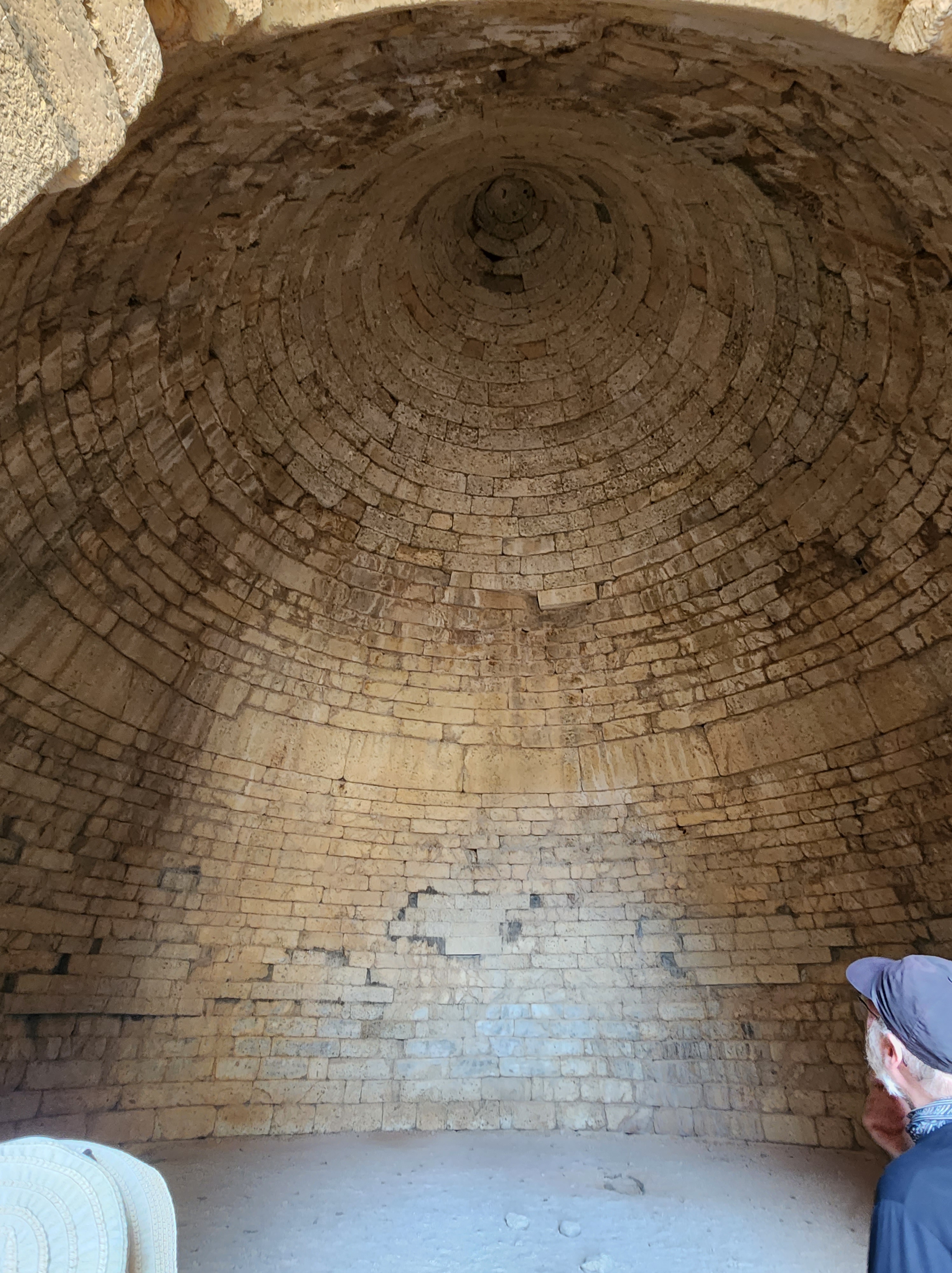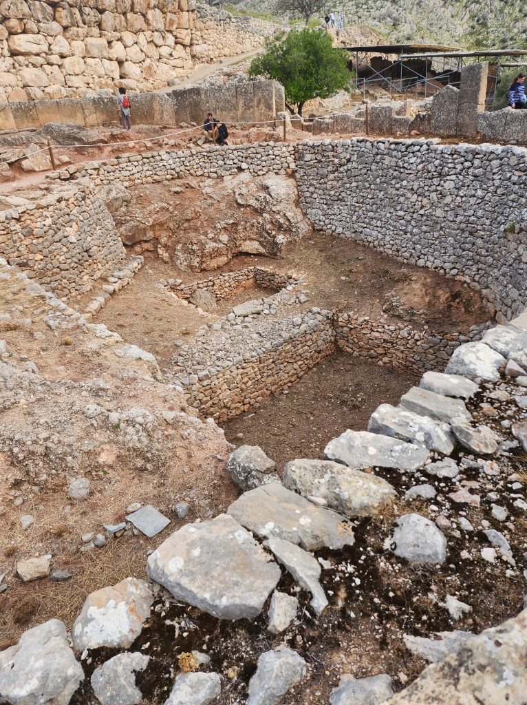 After a break for lunch, we visited one of the high points of the week for me, the site of Mycenae. For this site, we go back in time to 1600-1100 BC, the Bronze age, when Greek city-states were just forming as clusters of settlement around fortified palaces, and Mycenae is the best known example. The tall, fortified walls were nearly impregnable, and the entry way was narrow and angled to make it impossible for more than a few people to enter at a time.