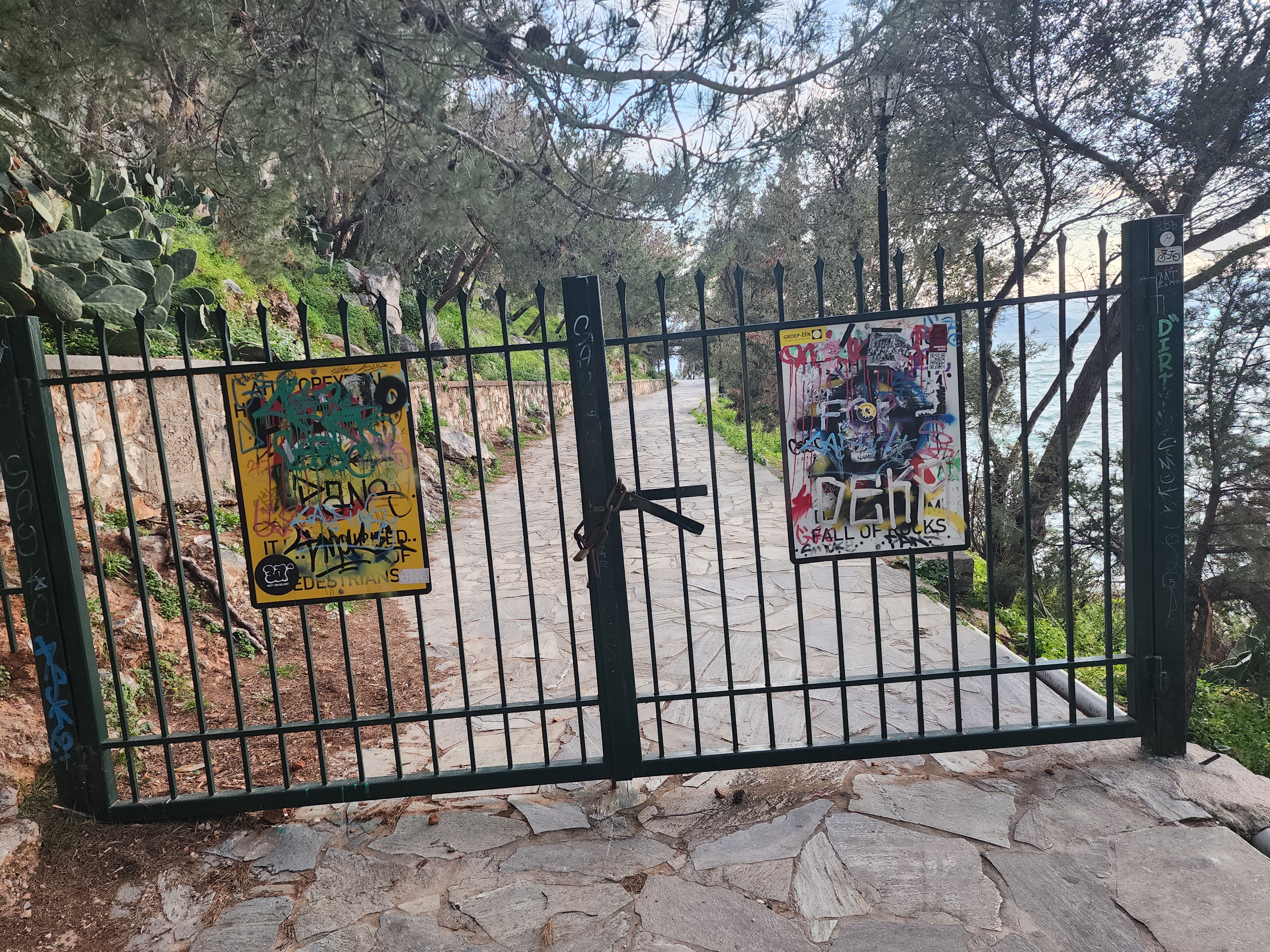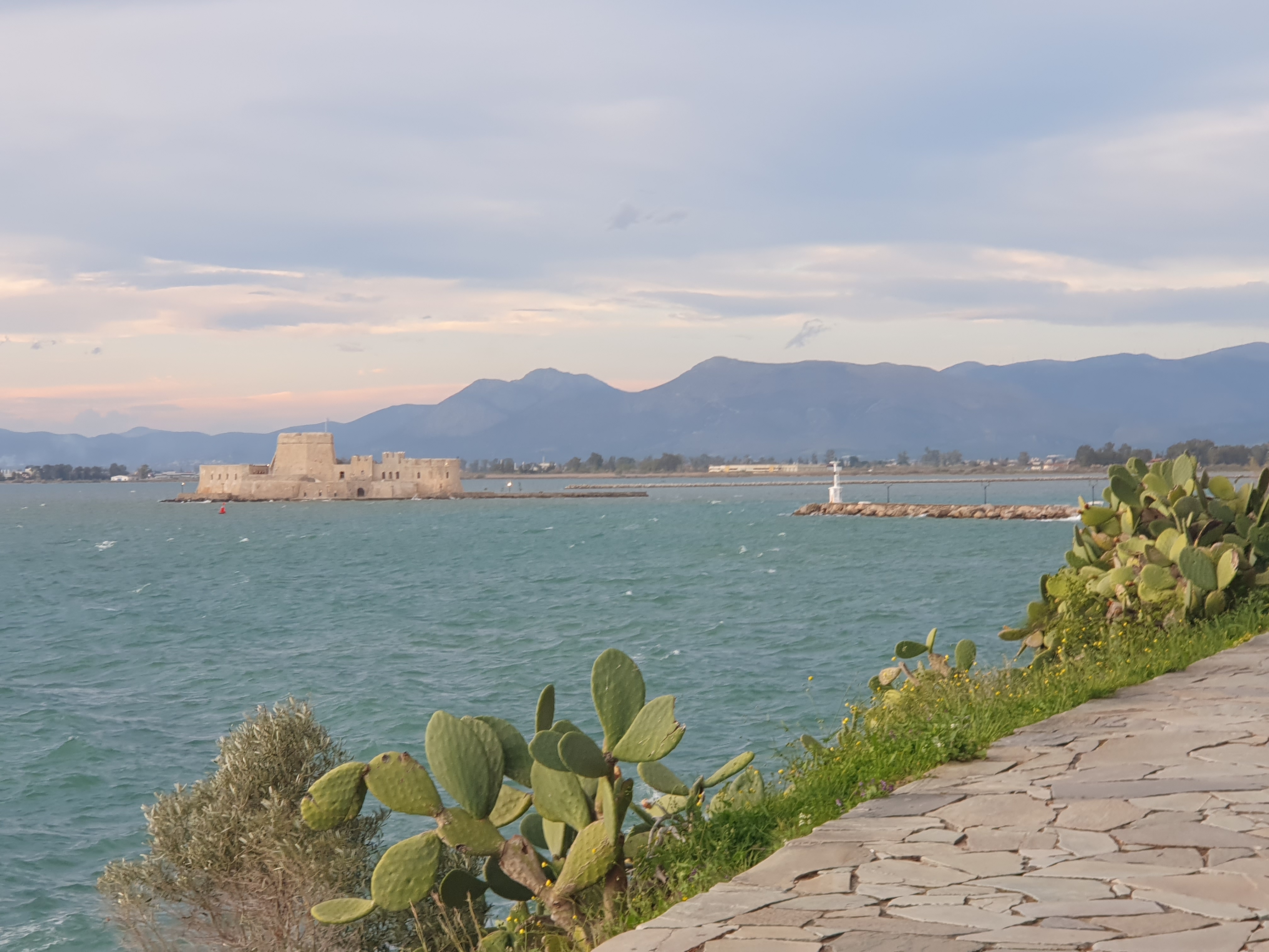 We had an excellent day, arriving at our hotel in Nafplio in time to head to a small beach just over the hill from our hotel. Once we were there, our phones indicated that the best way to get to our dinner spot was by walking around the point. We asked a man fishing if the path went all the way to the seafront on the opposite side and he said, “It’s not allowed, but everyone uses it.” Off we went. The walk took much longer than we had planned, but the spectacular views were worth it. We arrived in time for dinner at Savouras after a gorgeous stroll. After dinner, on our way to the hotel, we saw the illuminated Palamidi fortress on the top of the hill that towers behind Nafplio (bottom of page).