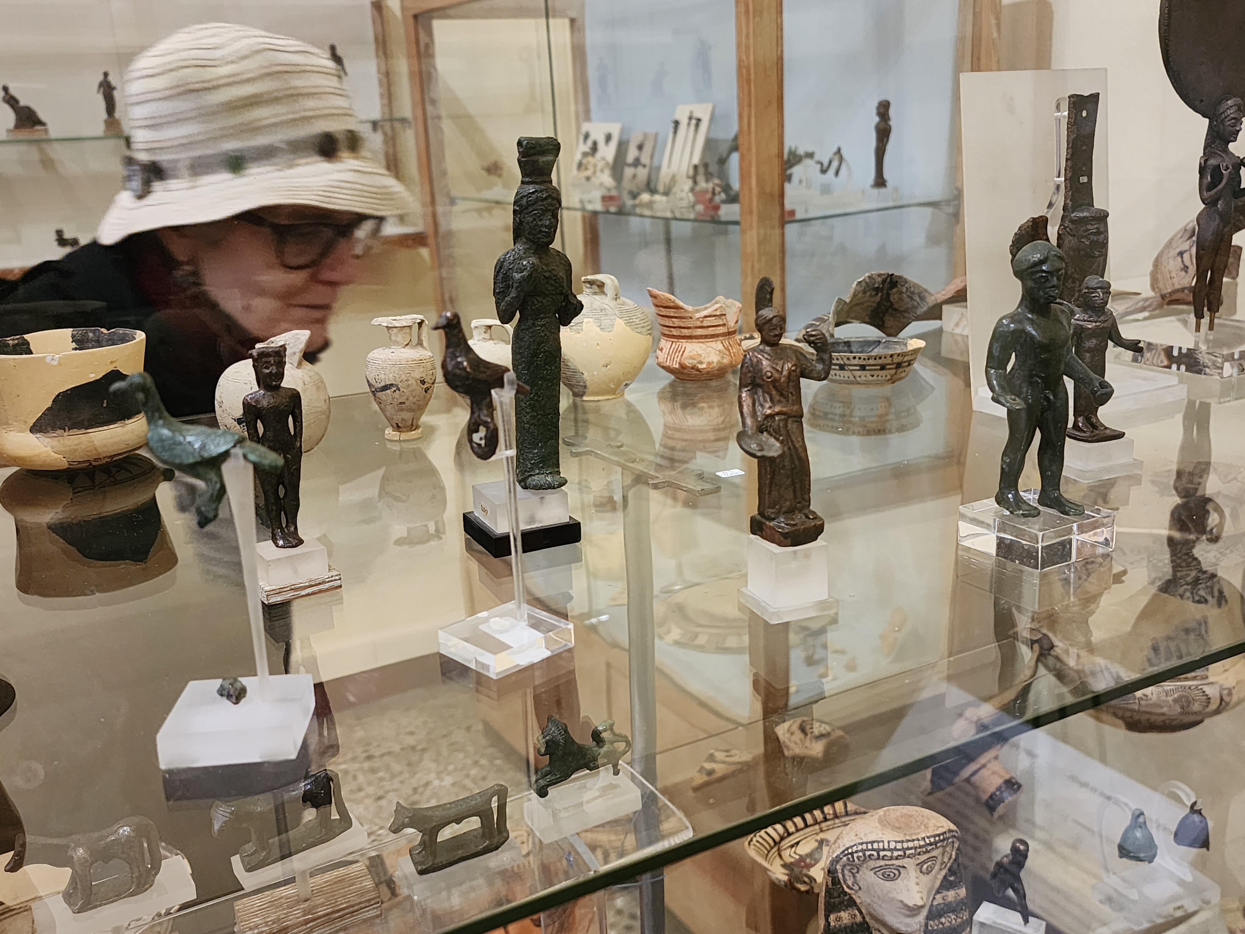 The museum at Sparta was full of rewarding things to see. Thousands of votive offerings from small cut-out bone and metal shapes to cast bronze figurines were buried over the centuries in and around the temple of Artemis Orthia, by people who wished for a favor from the gods.