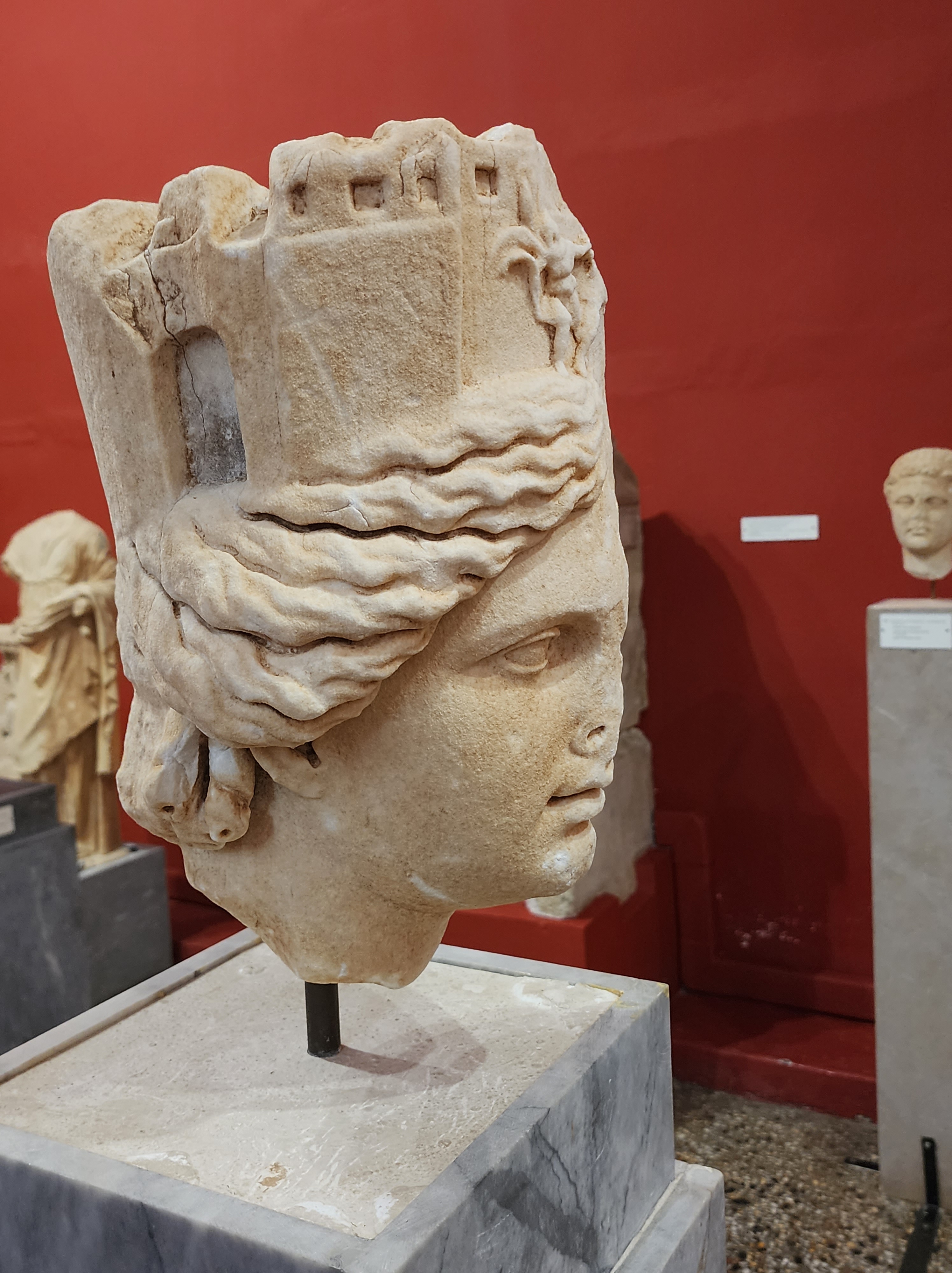 (L-R): Mosaic of a triton; carving of wild boar; “Head of the goddess Tyche (Fortune), the city goddess of Sparta. Her tower-like turreted crown has relief representations of the walls of the city.