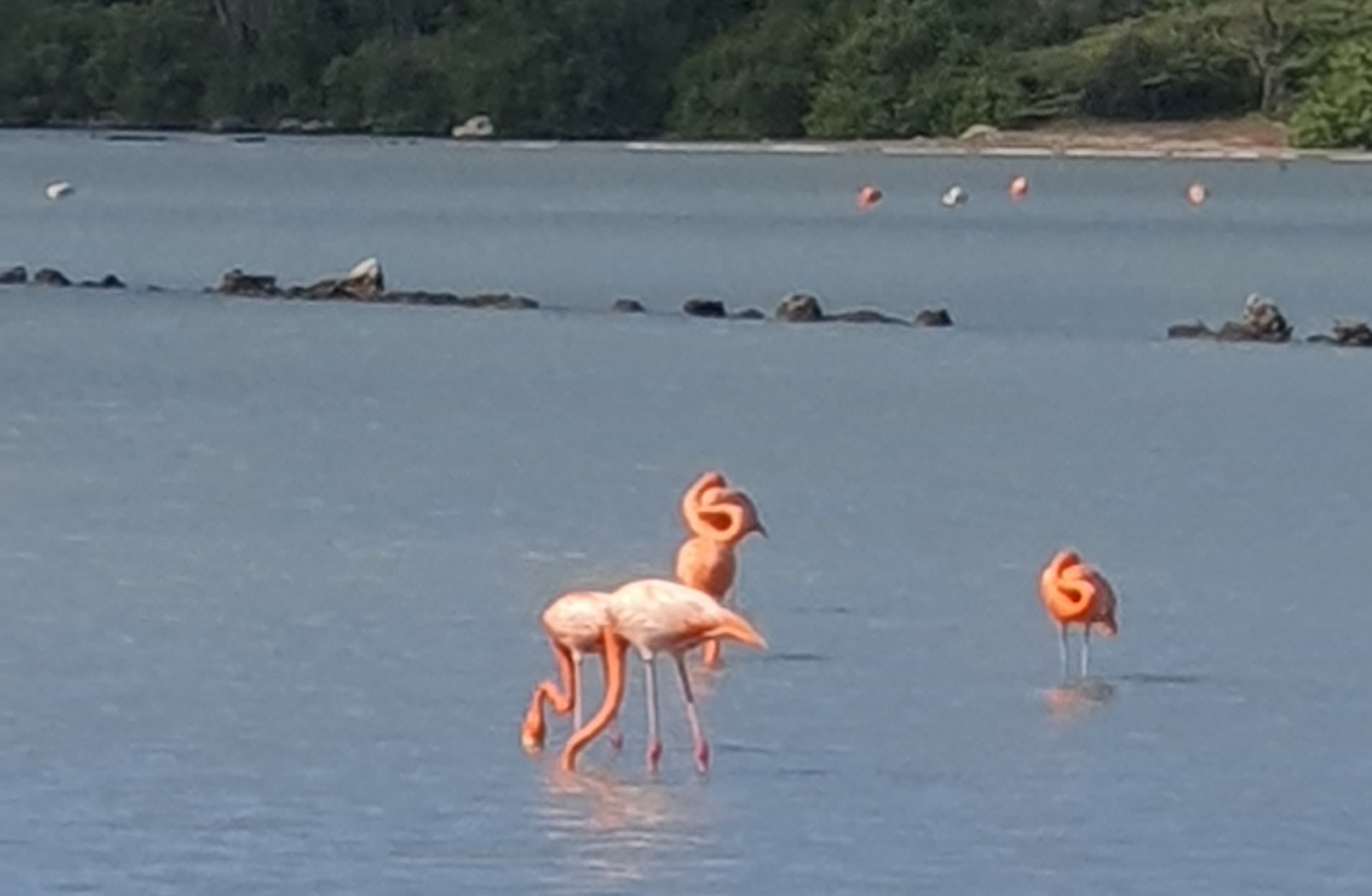 Our single outing to seek out birds took us to what is marked on maps at “flamingo habitat”. Sure enough, it was a shallow area full of flamingos. The flamingos were fun to watch. They put their heads under a wing when resting, but their necks are so long they have to coil them up. Amazing! I had hoped to see scarlet ibis, a brilliant bird of the mangrove, but we couldn’t find any on the day we went to look for them.