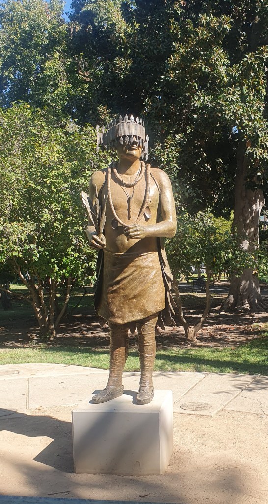 Having toured the historic portion of the capitol, we exited and found ourselves by a figure of a Miwok man. The Miwok are one of the many indigenous groups in California. This is not everyday clothing, this is a man dressed for a dance or ceremony, wearing a distinctive headdress.