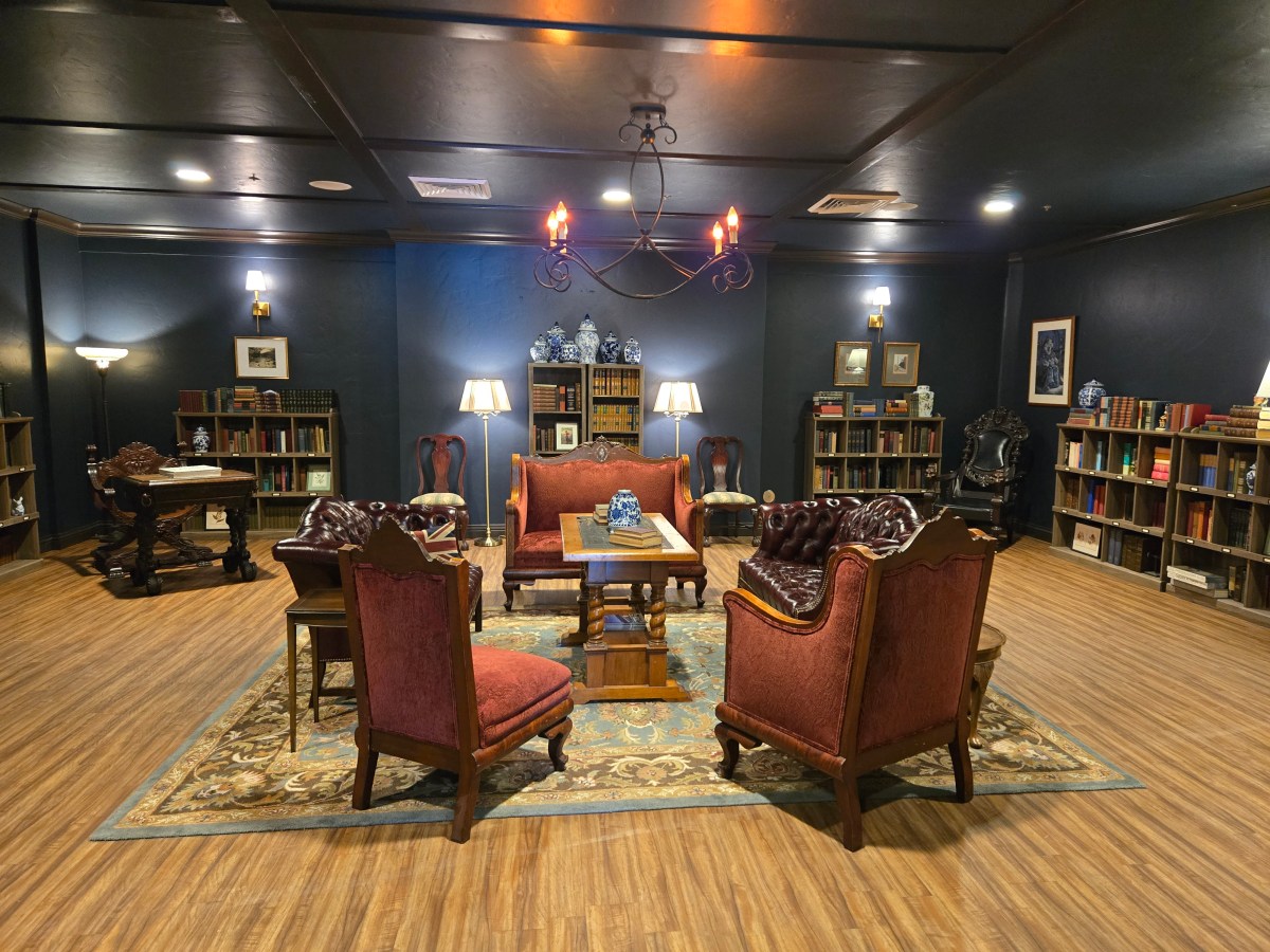 The Benbow Inn retains the vintage style of its origins. When we arrived, we entered the ground floor reception area. While Jonathan checked us in, I admired the library.