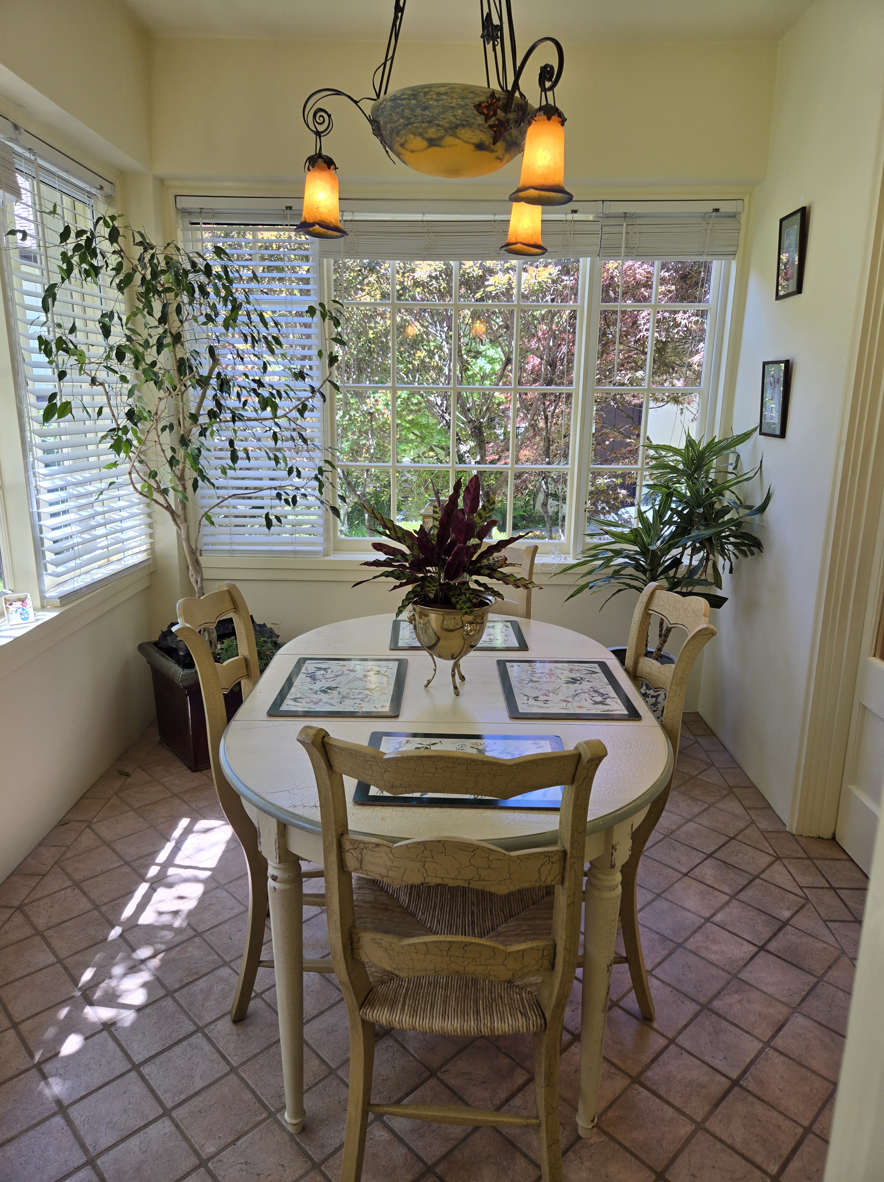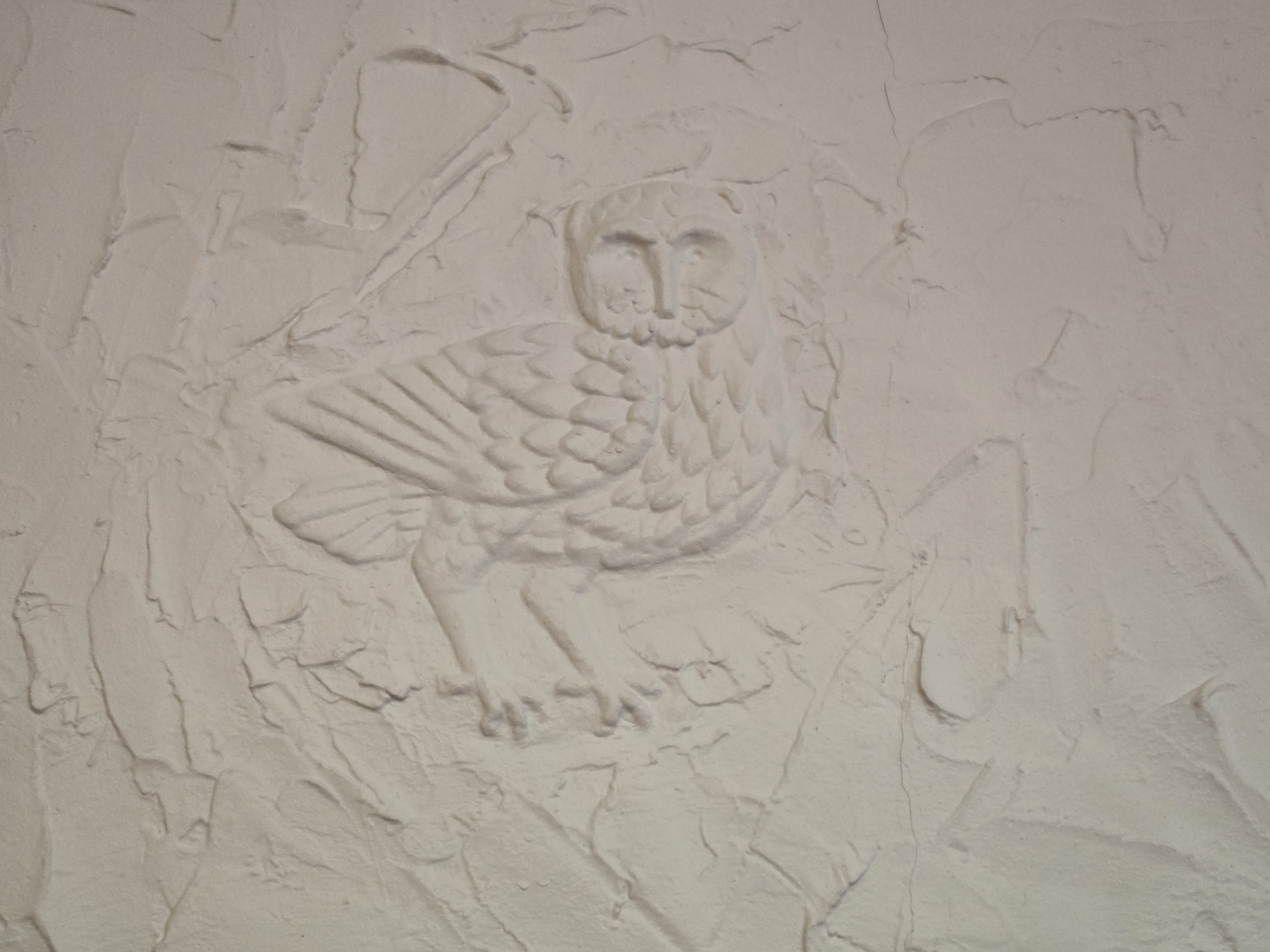 The house has been remodeled, and the elements of Julia Morgan’s design that remain are the overall structure, the redwood beams in the chapel, the built-in shelves and structural details that are hallmarks of the Craftsman style. Rosettes are carved along a number of beams; these were a hallmark of Morgan’s work. Birds appear in a number of details, such as the tile around a fireplace, and in wallpaper. Period details are part of the property’s charm.