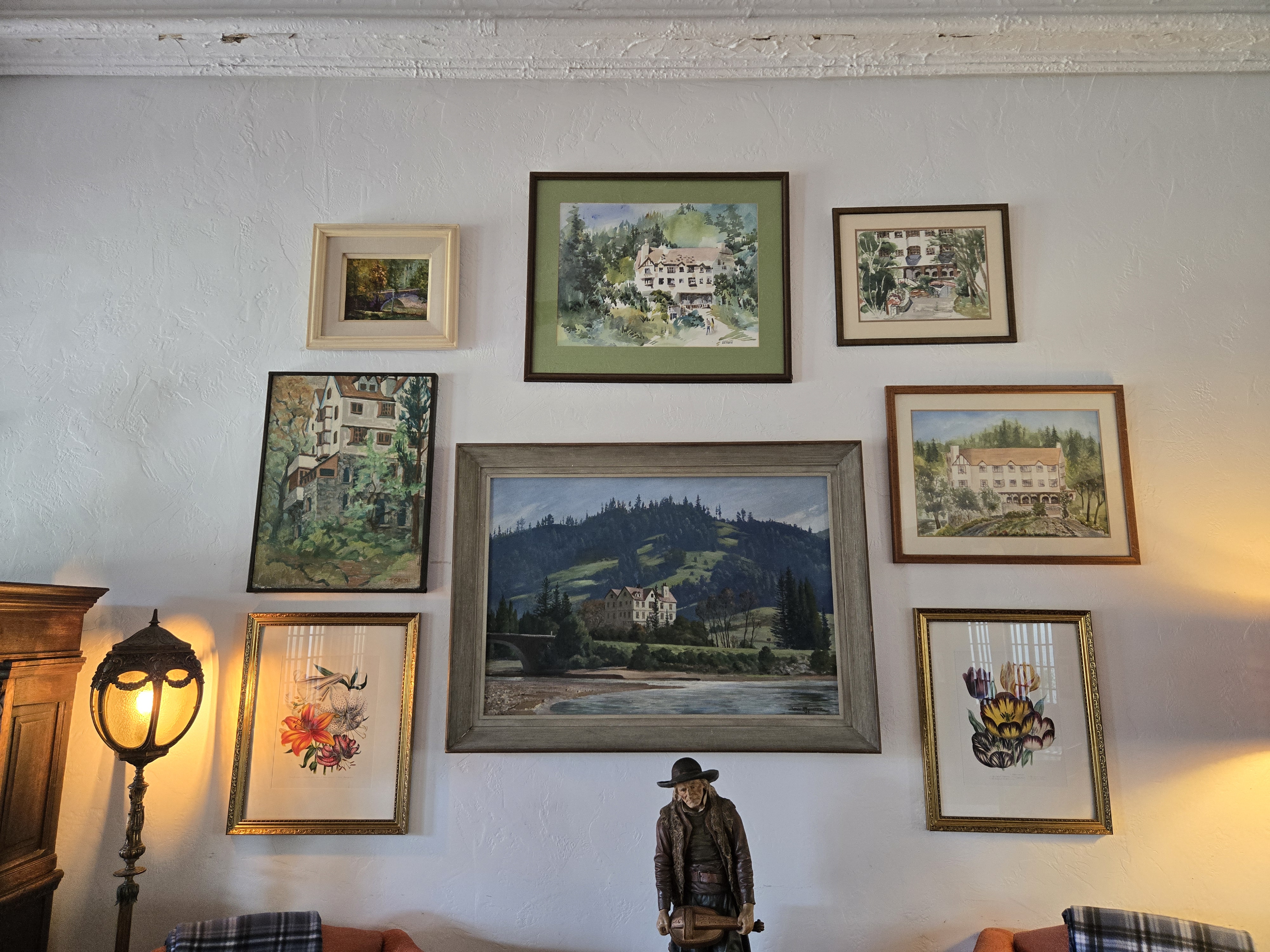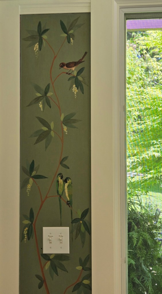 We were impressed by the lengths the various owners have gone to reproduce some of the home’s original details. The “leaping gazelle” fabric was used in curtains found hanging in tatters. Tanya and her husband Greg tracked down the original maker, a German company based in Italy, and had new fabric woven. Panels of wallpaper painted with birds were restored and placed in a conservatory that looks out over the Eel River. The entire conservatory had to be shored up so that it would not fall into the river.