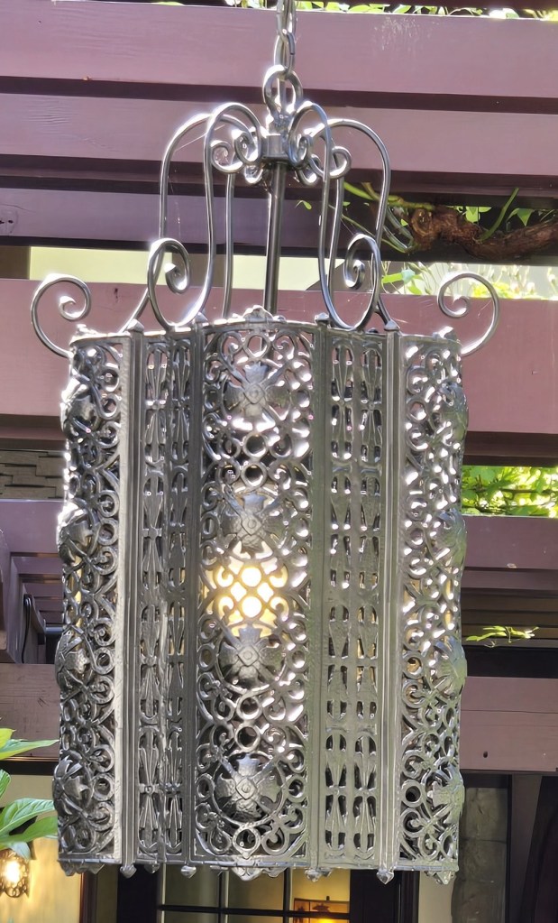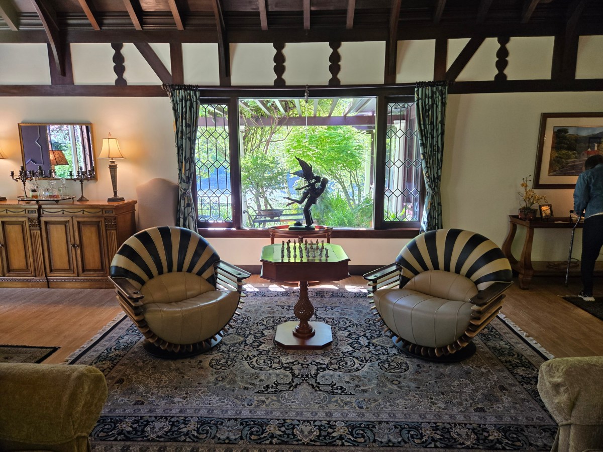 We met owner Tanya Musgrave at the end of the long driveway to the property. She arrived in a golf cart to give a lift to those who weren’t ready for a hike before the site visit. Arriving at the property, we entered a large reception room that looks very much like a chapel. Morgan designed it to have the air of a chapel, with a peaked roof and stained glass panel, though it was not specifically used as a religious space. I sat in one of the outrageous chairs (Egyptian Revival?) while Tanya told us the story of the house. After Margaret Stewart, the house passed through several owners and gradually fell into disrepair. By 2000, the house was at the point of abandonment when it was taken on as a personal restoration project by Allison Huegel and Jim Sergi, a couple from the Bay area, who put time, effort, and a lot of money into restoring the structure.