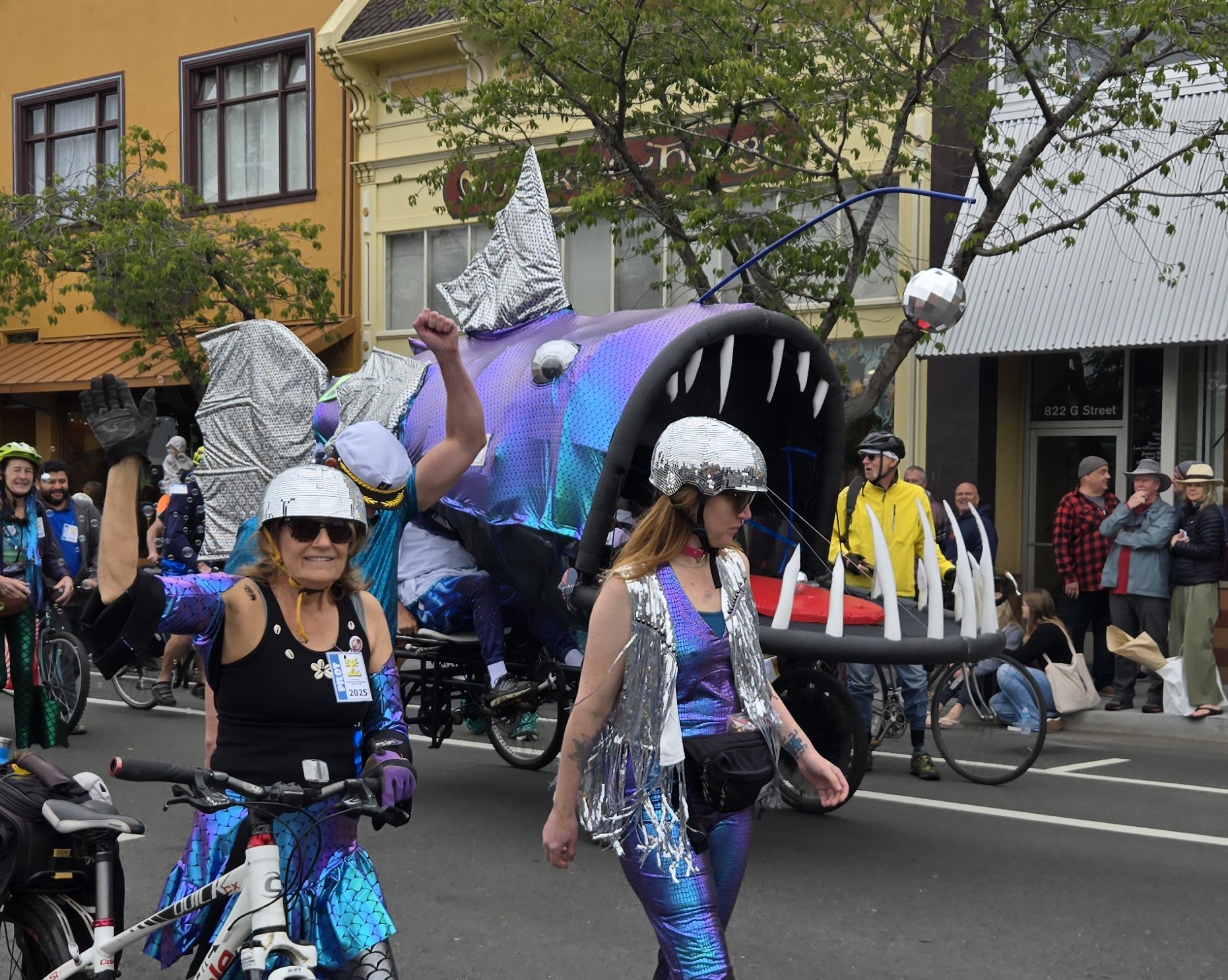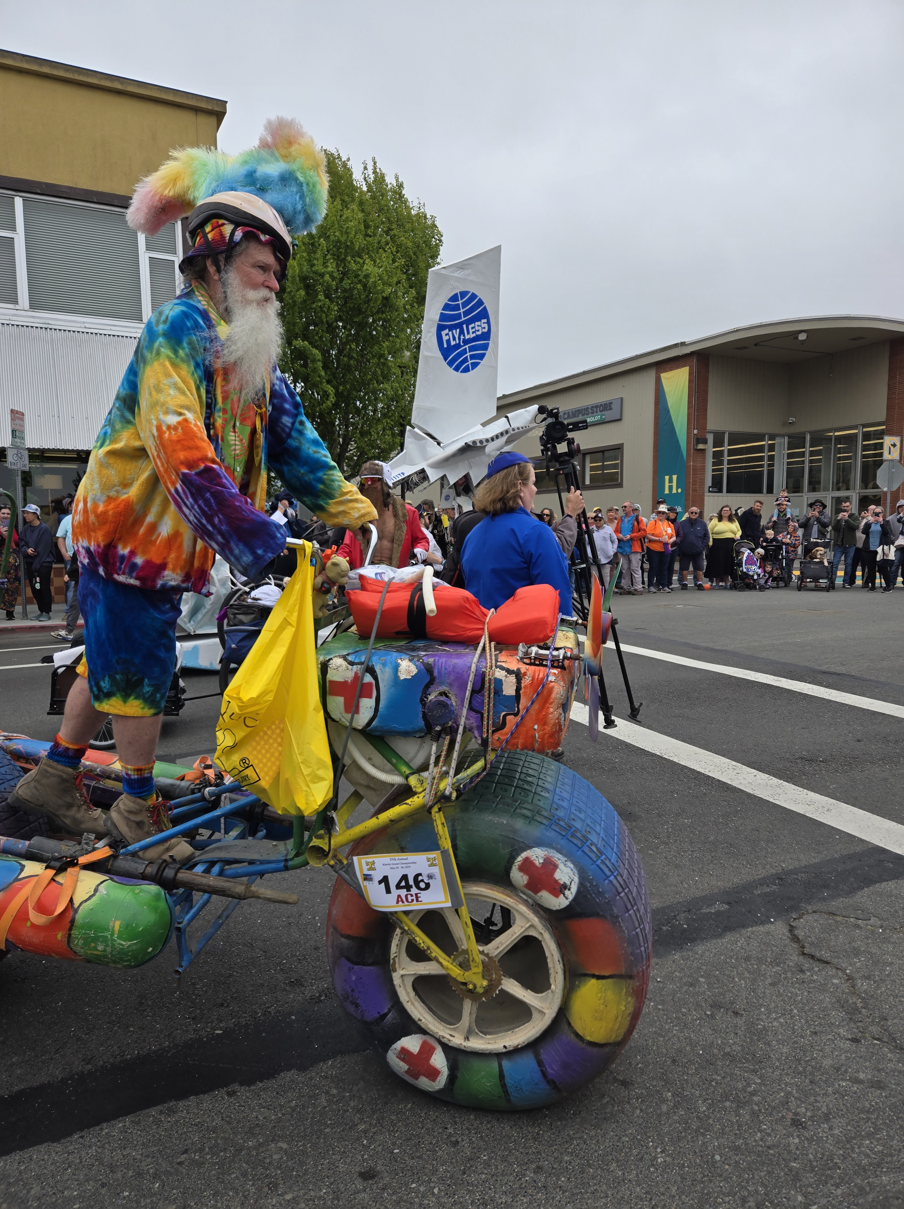 Among the many categories of racers are those who travel with the ability to enter the water at any time (Ace) and those who stop and strap on pontoons or flotation devices so that they can pedal their way the 500 yards or so downstream. When the vehicles emerge from Humboldt Bay, they follow a course of back roads that take them by Eureka Natural Foods, where they have lunch, then zig and zag to the coast, ending the day at Crab Park, almost 20 miles down the coast.