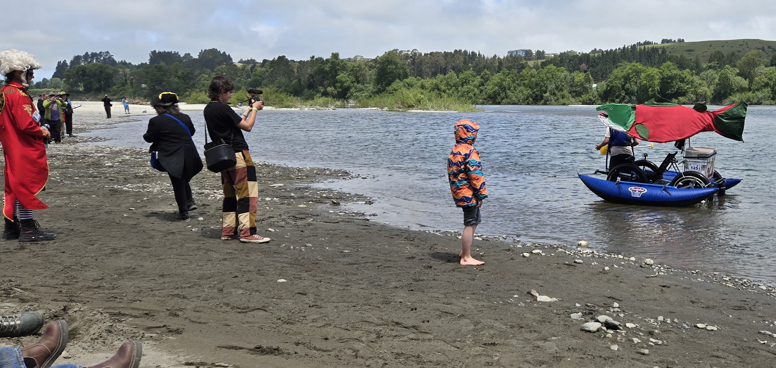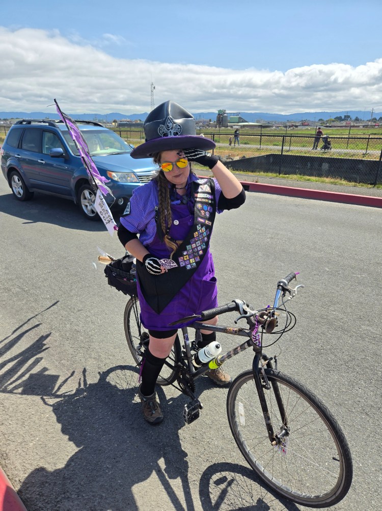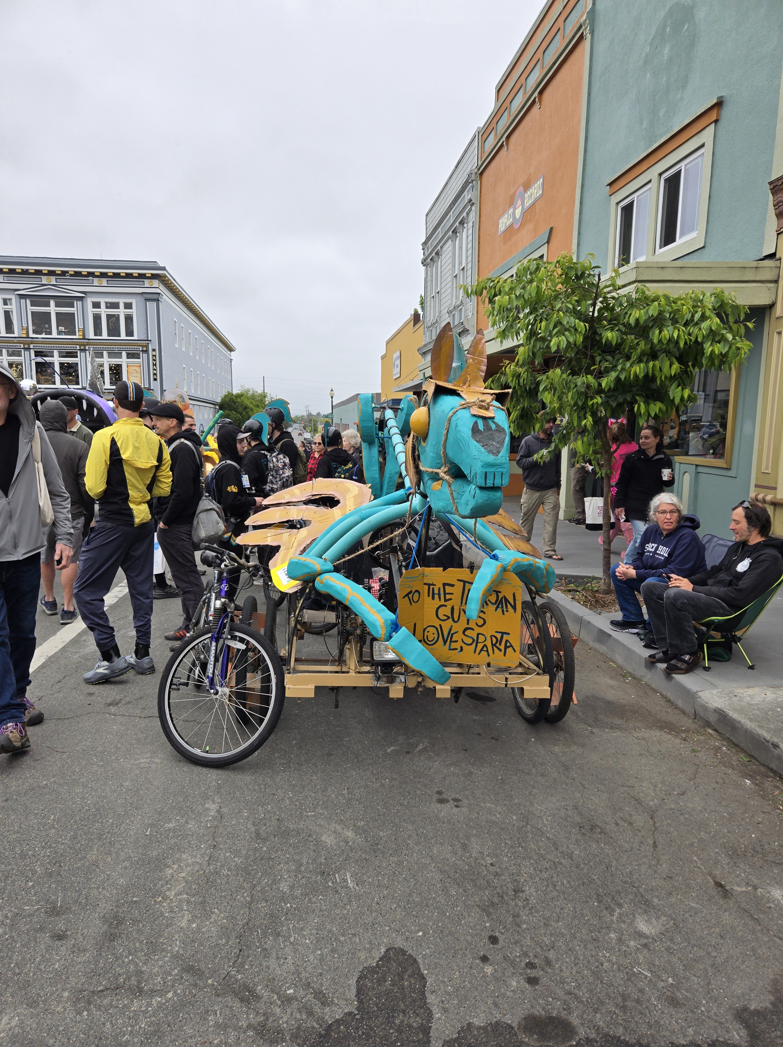 Sunday begins at the city marina where the racers form a long line awaiting their turn to pedal down the ramp into Humboldt Bay. Spectators can walk along the lineup taking pictures and chatting with the drivers and crews of supporters. A compliment may get you a bribe, a small token with the name of the device, a drawing, or motto. Many of us wear the bribes we received in previous years on our hats and vests. Last year’s “Ham-Tastic Glory” has been transformed into this year’s “Ghoul Scouts,” complete with black and purple uniforms and lots and lots of merit badges.