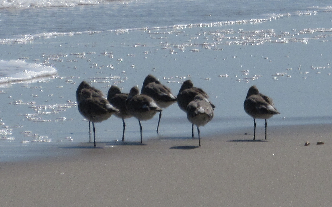 Clockwise from upper left: Willet, mergansers and snowy egret, piping plover, white-rumped sandpiper, the beach.