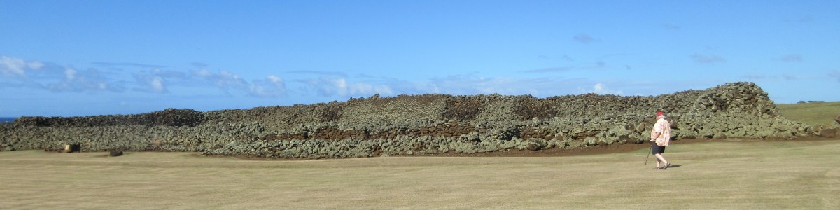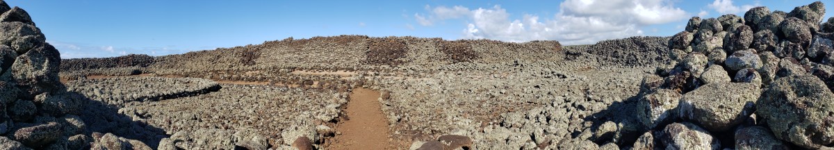 Very near by is the Mo’okini heiau (hey-ow), a ceremonial center that was the focus of large gatherings and offerings. There are many heiau around Hawaii, ranging in size from a single large rock on a stone platform, to huge enclosures. Mo’okini is distinctive as one of the oldest and largest heiau on Hawaii. It was also a luakini heiau, a place used for animal and human sacrifice. An associated tale recounts that the heiau was built of stone passed hand to hand across eleven miles from the source to the Mo’okini site. The structure is an enormous rectangle made of stacked dry stone that is roughly 250 ft x 120 ft in size. The walls are ten feet thick at the base.