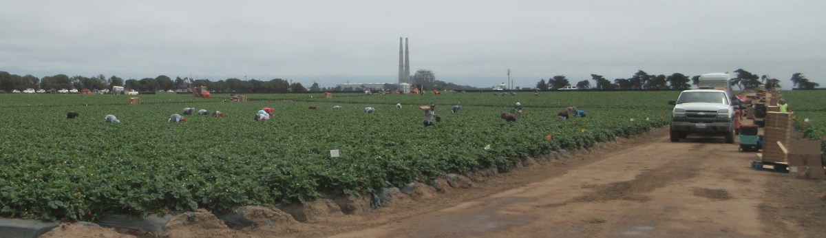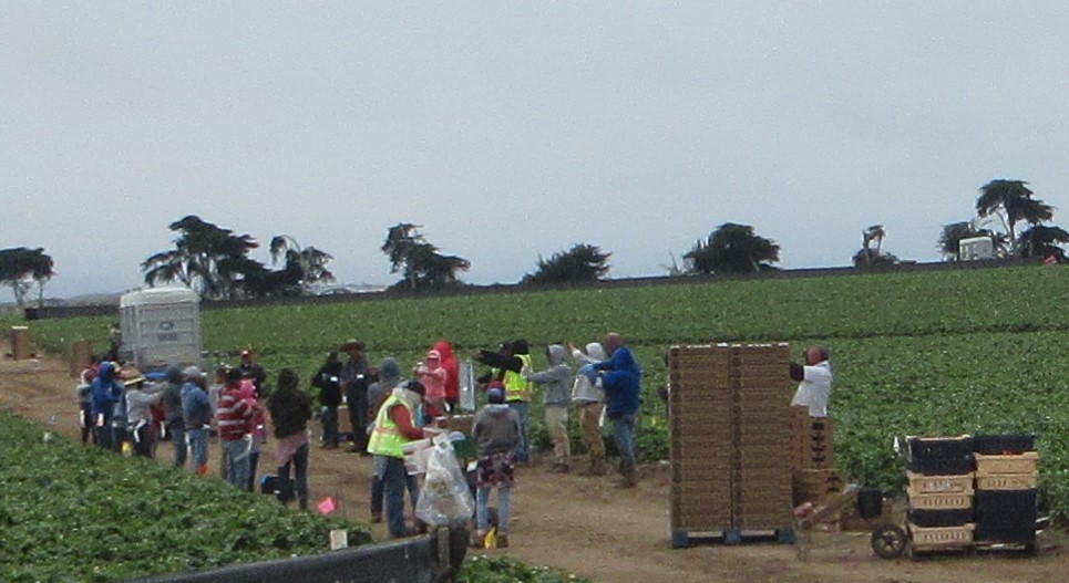 Our goal was the beach, but we were captivated by the activity in the fields. Many of the fields are planted with strawberries, though there is lettuce, cabbage, broccoli, brussel sprouts, and artichokes. We passed cluster after cluster of thirty to forty people, accompanied by a bus or truck towing portajohns, and a long line of parked cars. We passed numerous groups and figured there must have been 300-400 people at work. On the way in, around one pm, we saw people sitting on folding chairs in a circle near one of the vehicles. On our way out a couple of hours later, everyone was picking, and the lawn chairs were gone.