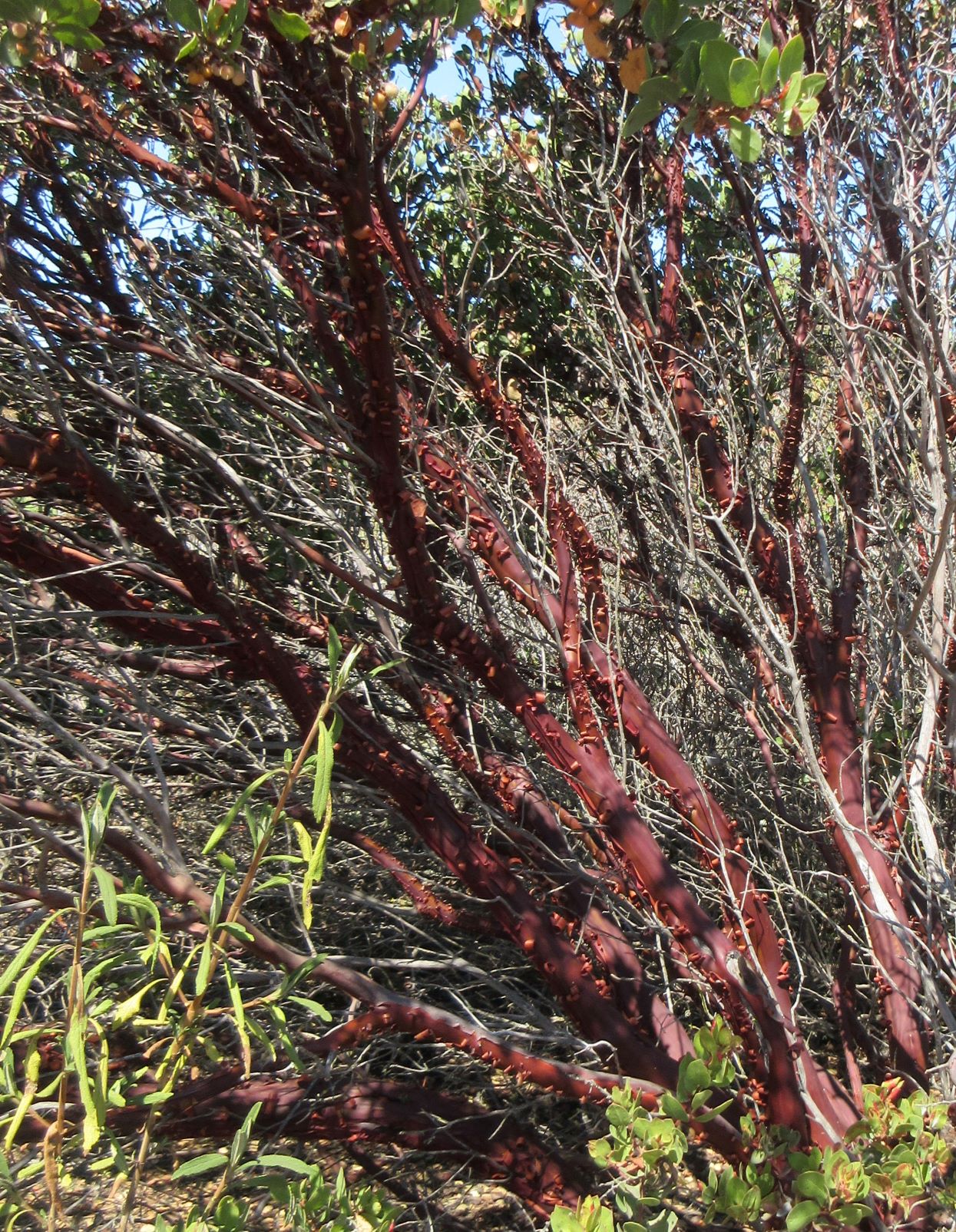 As we turned to walk back along the escarpment we noticed the deep red bark of madrone, a tree with distinctive red-orange bark. It appears to grow on the mesa tops here, but we found no more growing once we crossed through the gap in the rocks and went down hill. The trail puts a bit of stress on the knees, but it was a lovely walk, the sun was out, and nothing could be better. We intend to keep visiting Ft. Ord to see more of those miles of trails.