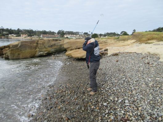 Pebble Beach and its surroundings is a golfer’s paradise, with a golf course around every corner, and spectacular coastal scenery beyond. We were curious about whether people actually play the holes that jut out along the cliffs, and they do. There were people teeing off from a tiny patch of green surrounded by rocks on the edge of a dropoff. Fortunately, they were hitting back toward land and not trying to drop a golfball onto a tiny green. It looks like that would be as difficult as landing a SpaceX module. Jonathan had his big moment at Pebble Beach, swinging his beach scoop/golf club for a perfect shot. We did find some beach glass. Not a lot, but worth the visit. We decided against lunch at the club house, and went home for a break.