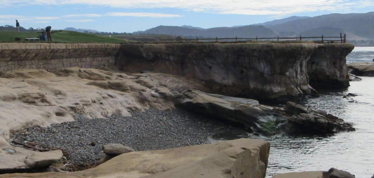 There are signs directing visitors to parking. This being California, access to the shore is guaranteed by law, and no one, not even David Geffen, the Pebble Beach resort, or anyone else, can keep the public off the shore between the low and high tide lines.We actually found a marked coastal access pathway crossing the parking lot and heading down the side of the clubhouse to the sandy beach. Getting to the pebbly beach required crossing a short stretch of the course, so we looked both ways and scuttled across safely.