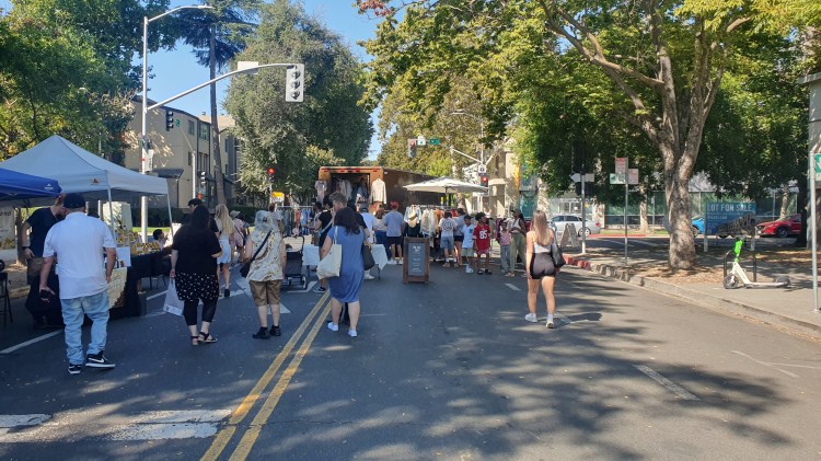 I had a chance to make brief visits to two of the many farmer’s markets in Sacramento. I began with the Oak Park market, small and friendly, where I bought pumpkin spiced pound cake and plums. Later the same Saturday, I went to the Midtown Farmers Market that extends outward several blocks in each direction from 20th and K Sts., just north of the State Capitol complex. I could have spent much more time at this market, there were all kinds of vendors from fruit (mostly Asian pears, plums, and grapes), vegetables (tomatoes, squash, and early fall produce) to food, beverages, and crafts.