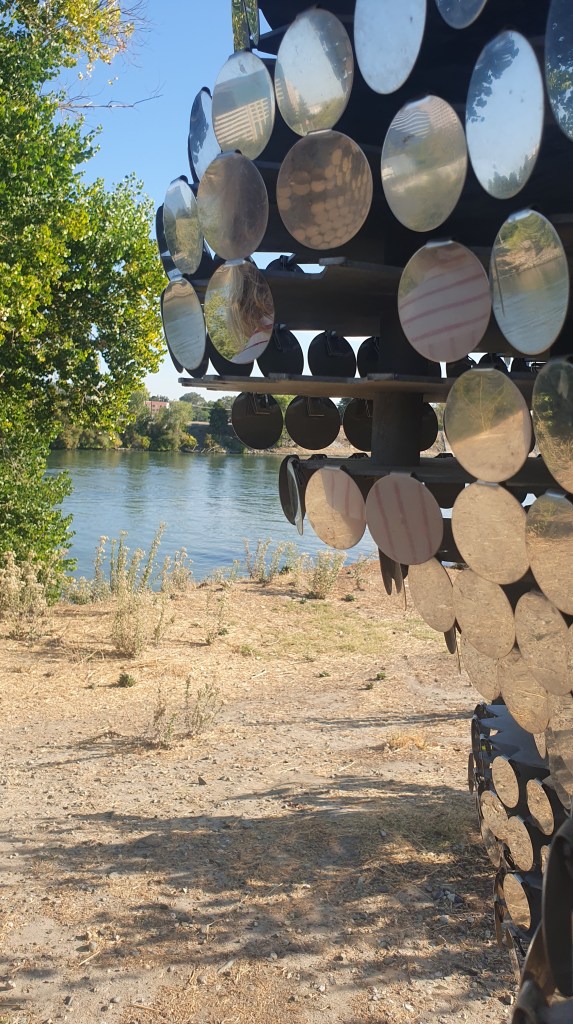 Suzy, Molly, and I then went on an adventure out of Atlas Obscura. For those of you not familiar with it, AtlasObscura.com keeps lists of unusual sights in many different locations. It provides a source of brief visits along any given route of travel, or day trips from any place you happen to be. There is a substantial list for Sacramento, and we chose one that Suzy hadn’t known about, the sculpture called Subtile, installed on the bank of the river in West Sacramento in 2017. By Czech artist Federico Diaz, the work is a large armature covered with small, silver-toned polished disks that move in the wind. The piece is shaped vaguely like a group of shrubs or trees, and shimmers like wind through tree branches.